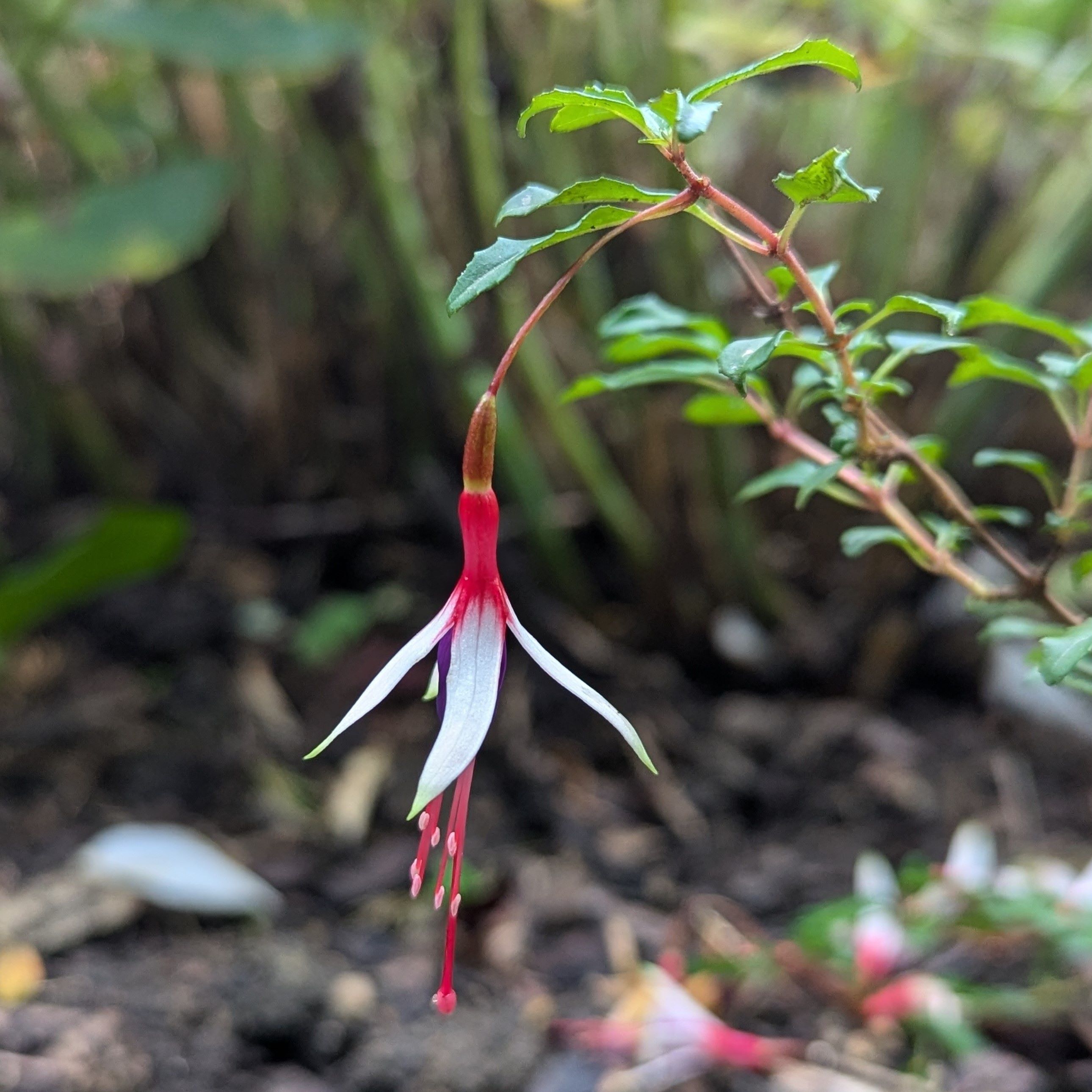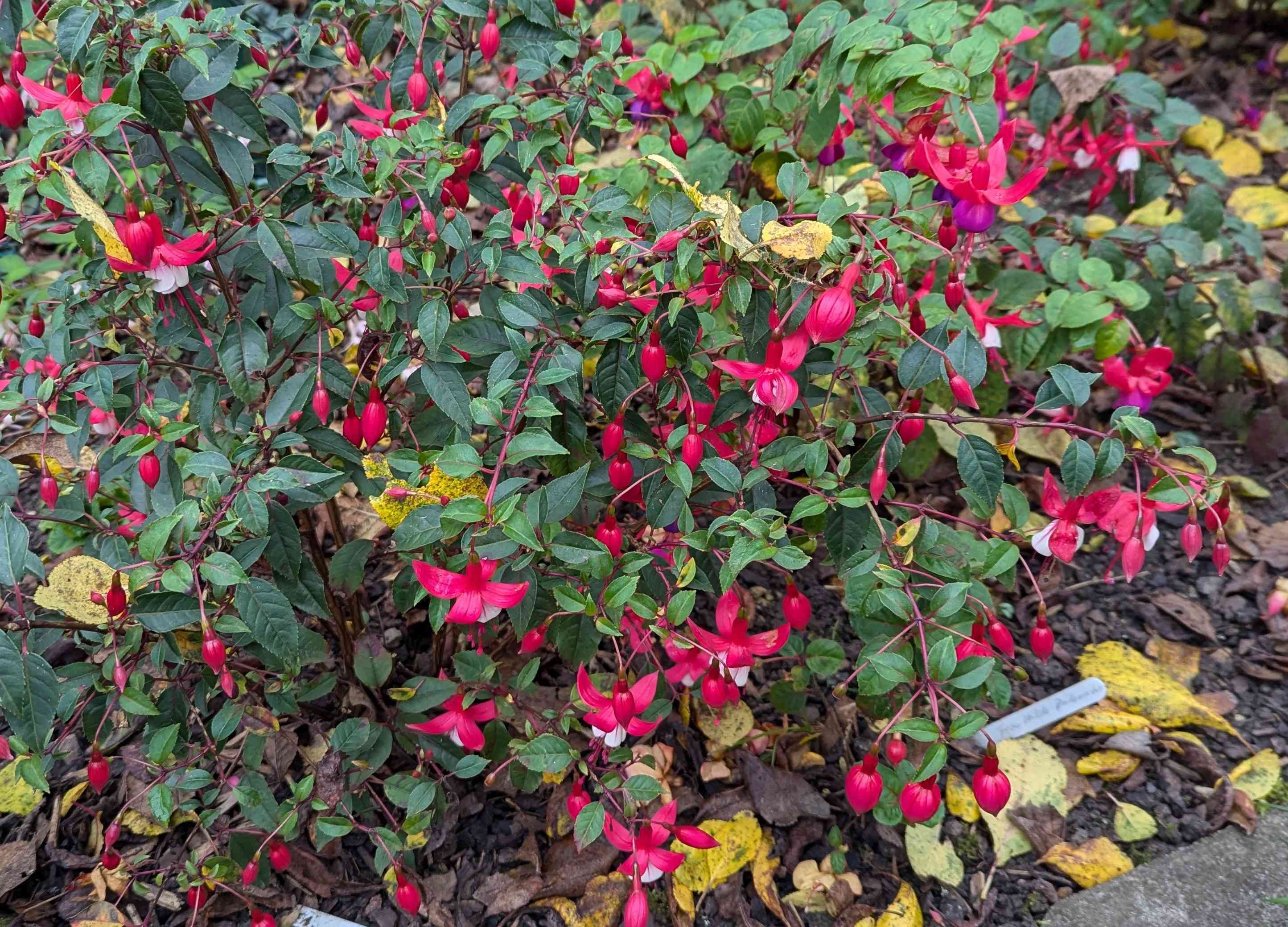 ich habe gestern mal meine einzige winterharte Fuchsie fotografiert. Die hatte ich für den Garten unseres Sohnes in einem Raiffeisenmarkt gekauft. Weil sie mir dann gut gefiel, habe ich Stecklinge gemacht und die Pflanze dann in meinen Garten gesetzt. Dort hat sie den ersten Winter gut überlebt und erhellt jetzt durch ihr teilweise gelbgrünes Laub die etwas dunkle Ecke. Kennt die vielleicht jemand?