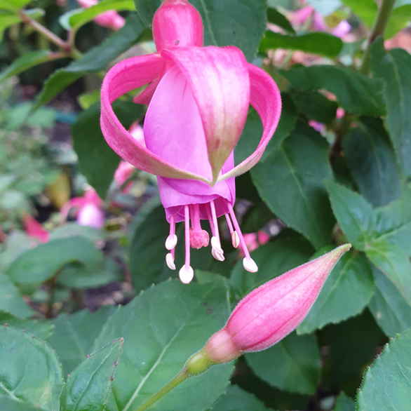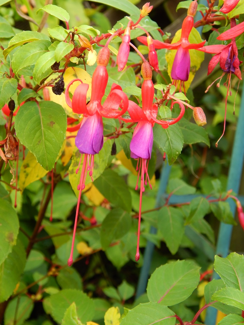 Der Stempel ragt sehr weit aus der Korolle. Das ist neben dem gelblichen Blatt ein gutes Erkennungszeichen. Ich habe heute noch die angekündigten Uralt-Fuchsien fotografiert. Es werden schon seit mindestens 20 Jahren stattliche Büsche.