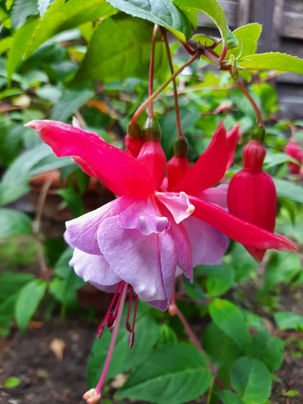 'Foxtrott ' ist eine aufrecht, breitbuschig wachsende Fuchsie. Die Blüten sind halbgefüllt und wirken gerüscht. Die Sepalen sind kirschrot und die Korolle zeigt sich lavendelfarben. Ich habe sie seit 2023 als Steckling bekommen. Sie hat sich gut entwickelt und ließ sich problemlos im frostfreien Gewächshaus überwintern. Schon im ersten Jahr war sie gut verholzt, darum war die Überwinterung einfach. Ihre volle Schönheit kam im zweiten Jahr erst richtig zur Geltung. Schon im Juni konnte ich die tollen, reichlich erscheinenden Blüten bewundern. Im Hochsommer gab es dann eine Blühpause, aber im Herbst durfte ich dann nochmals eine tolle Blüte bis zum Rückschnitt bestaunen.
