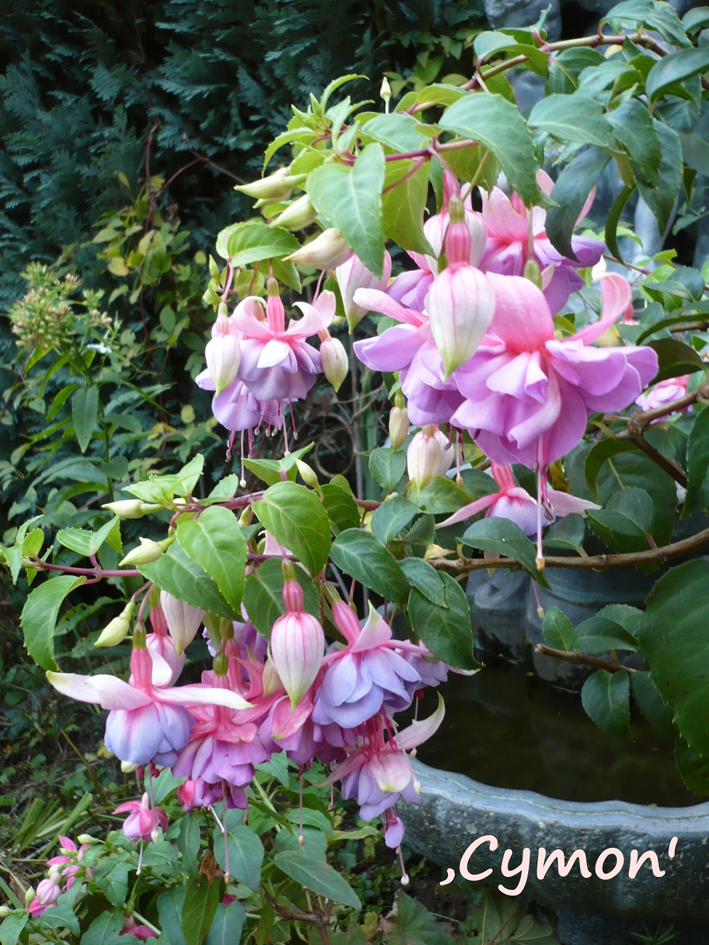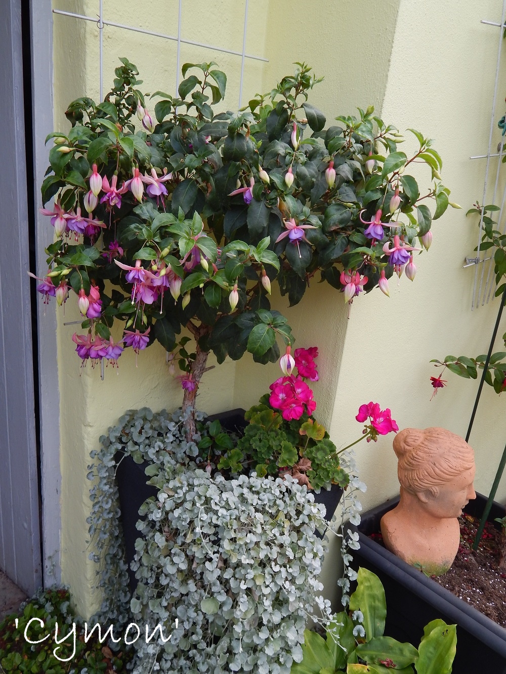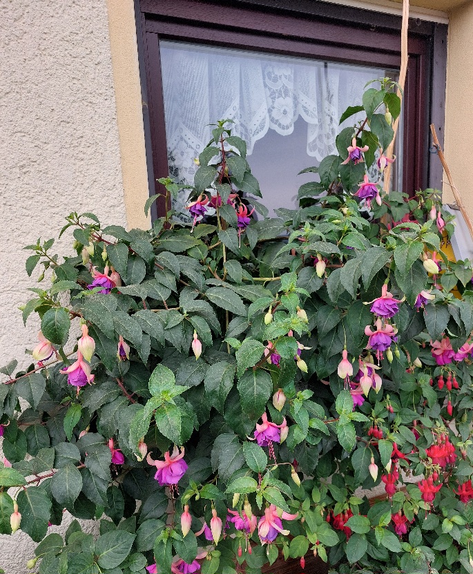 Ich hatte mir die Cymon vor 2 Jahren beim Fuchsien Graupner, auf diese Einträge hin, gekauft. Das erste Jahr hatte sie nicht eine einzige Blüte gebracht. Die Pflanze sah aber beim Kauf auch sehr verkrüppelt aus. 2024 kam sie dann mit noch zwei Fuchsien in einen 80iger Blumenkasten mit Wasserversorgung. Auf dem letzten Bild sieht man, wie groß die Pflanze geworden ist, mein Mann hat sich beschwert, da er in seiner Werkstatt dadurch nur wenig Licht hatte und die Fuchsie in der Mitte, Caspar Hauser hatte es auch sehr schwer.