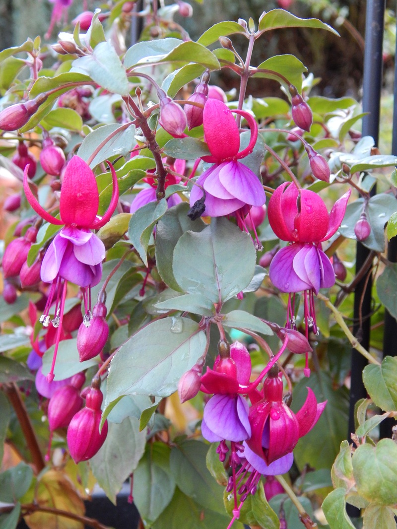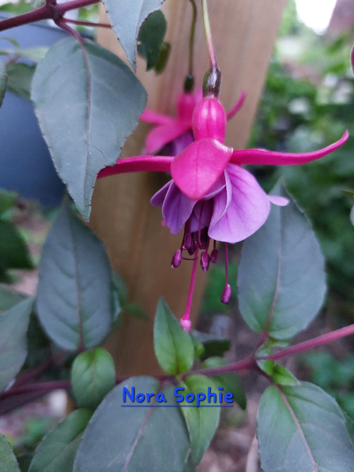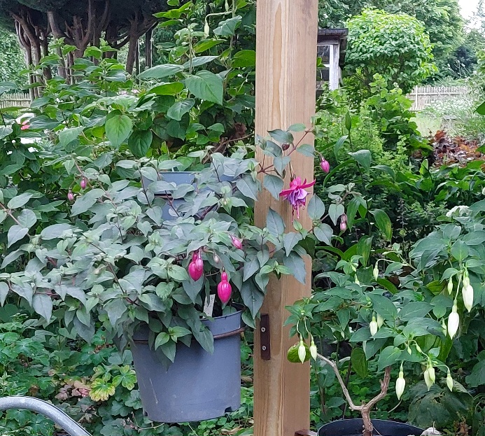 Nora Sophie habe ich im Frühjahr aus Melnek erhalten. Sie ist, wie man auf Bild 2 und 3 sehen kann, in kürzester Zeit zu einer großen Pflanze mit vielen Blütenansätzen herangewachsen. Sie hat wunderschönes dichtes und dunkles Laub und wurde nicht einmal entspitzt. In unserer Fuchsiengalerie ist sie sehr gut beschrieben. Eine umwerfende Fuchsie, die bei mir zur Zeit im tiefen Schatten steht.
