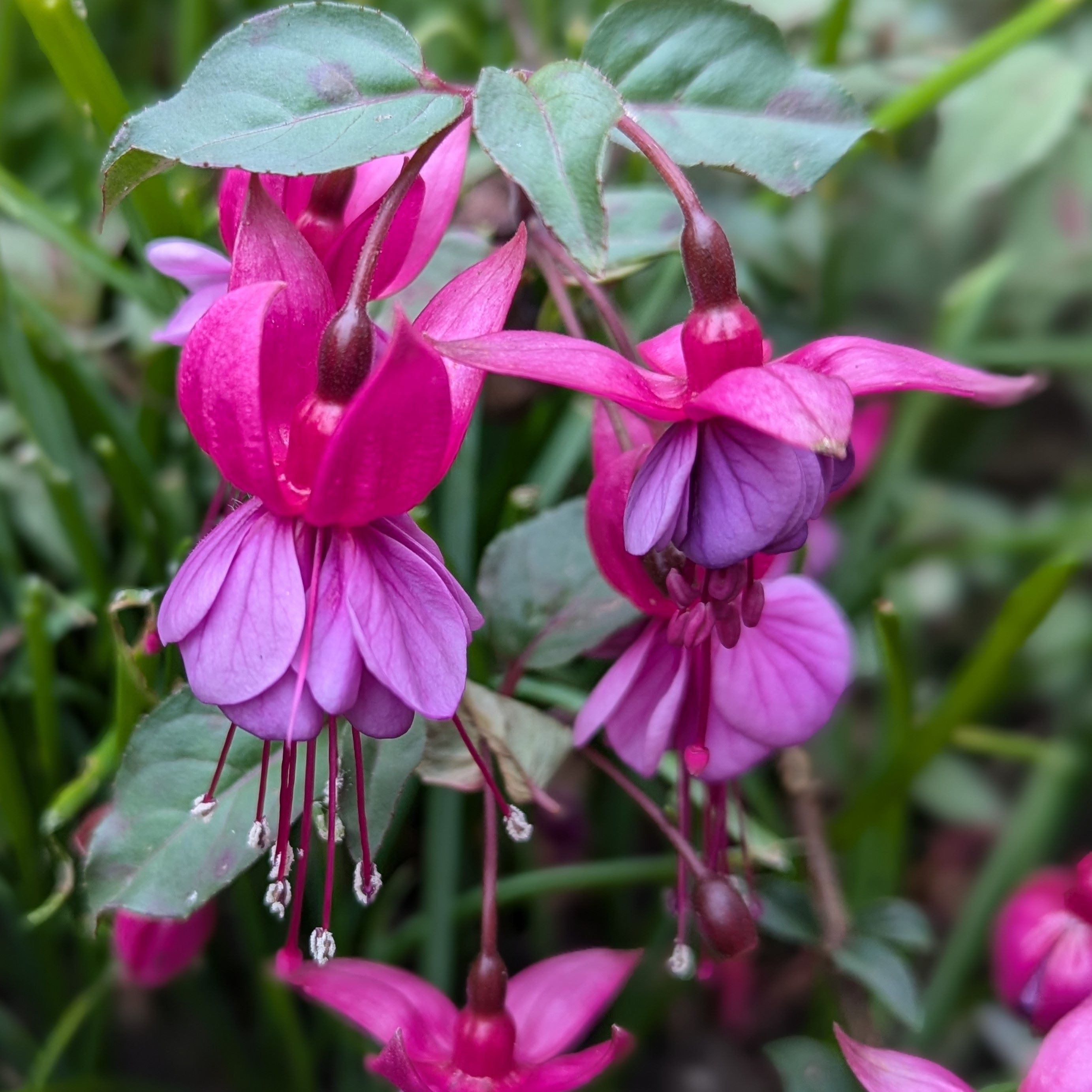 Nora Sophie habe ich im Frühjahr aus Melnek erhalten. Sie ist, wie man auf Bild 2 und 3 sehen kann, in kürzester Zeit zu einer großen Pflanze mit vielen Blütenansätzen herangewachsen. Sie hat wunderschönes dichtes und dunkles Laub und wurde nicht einmal entspitzt. In unserer Fuchsiengalerie ist sie sehr gut beschrieben. Eine umwerfende Fuchsie, die bei mir zur Zeit im tiefen Schatten steht.