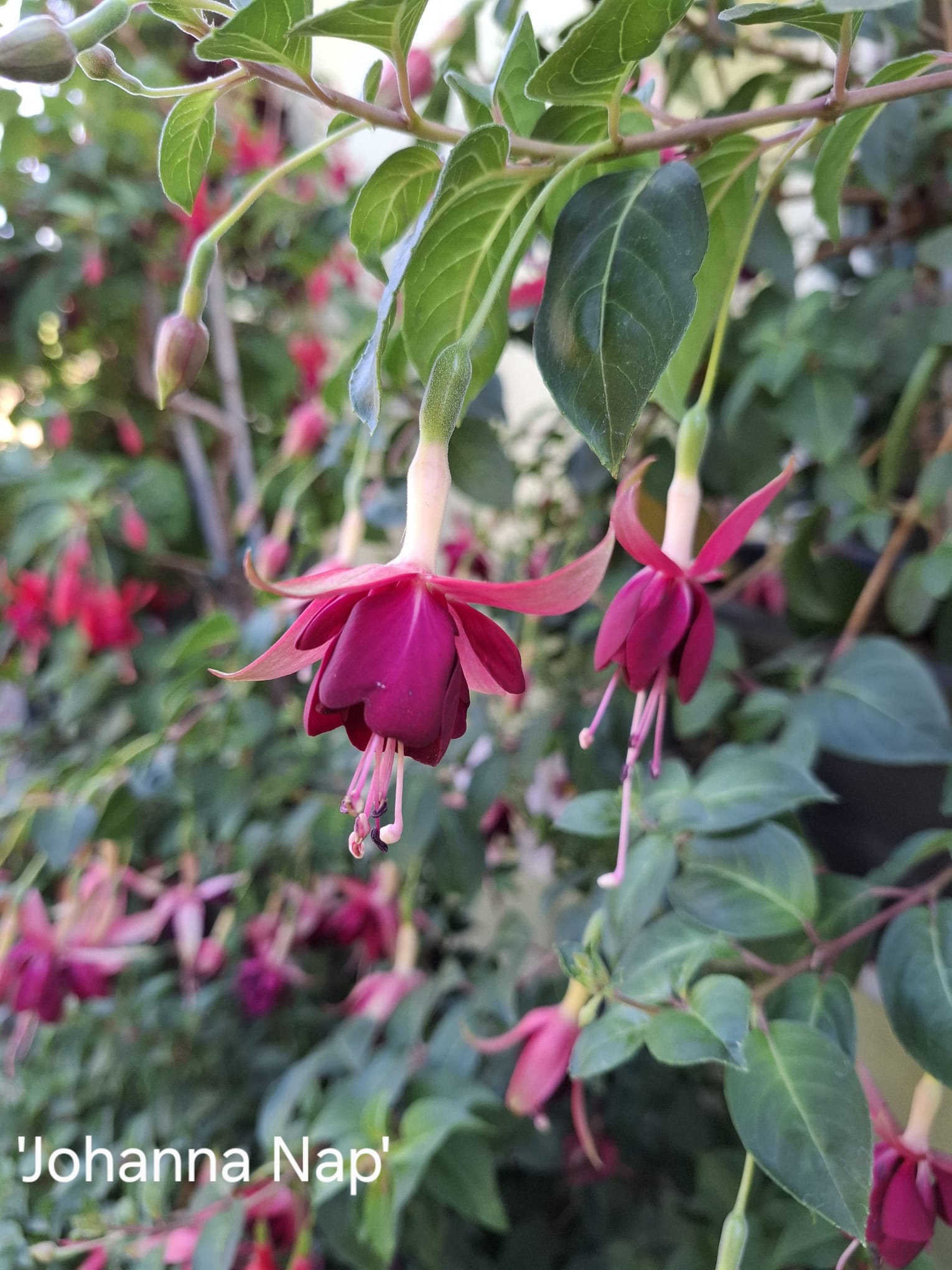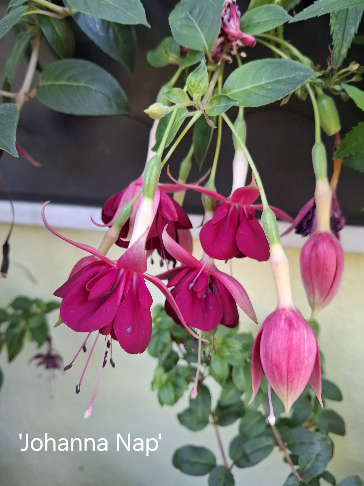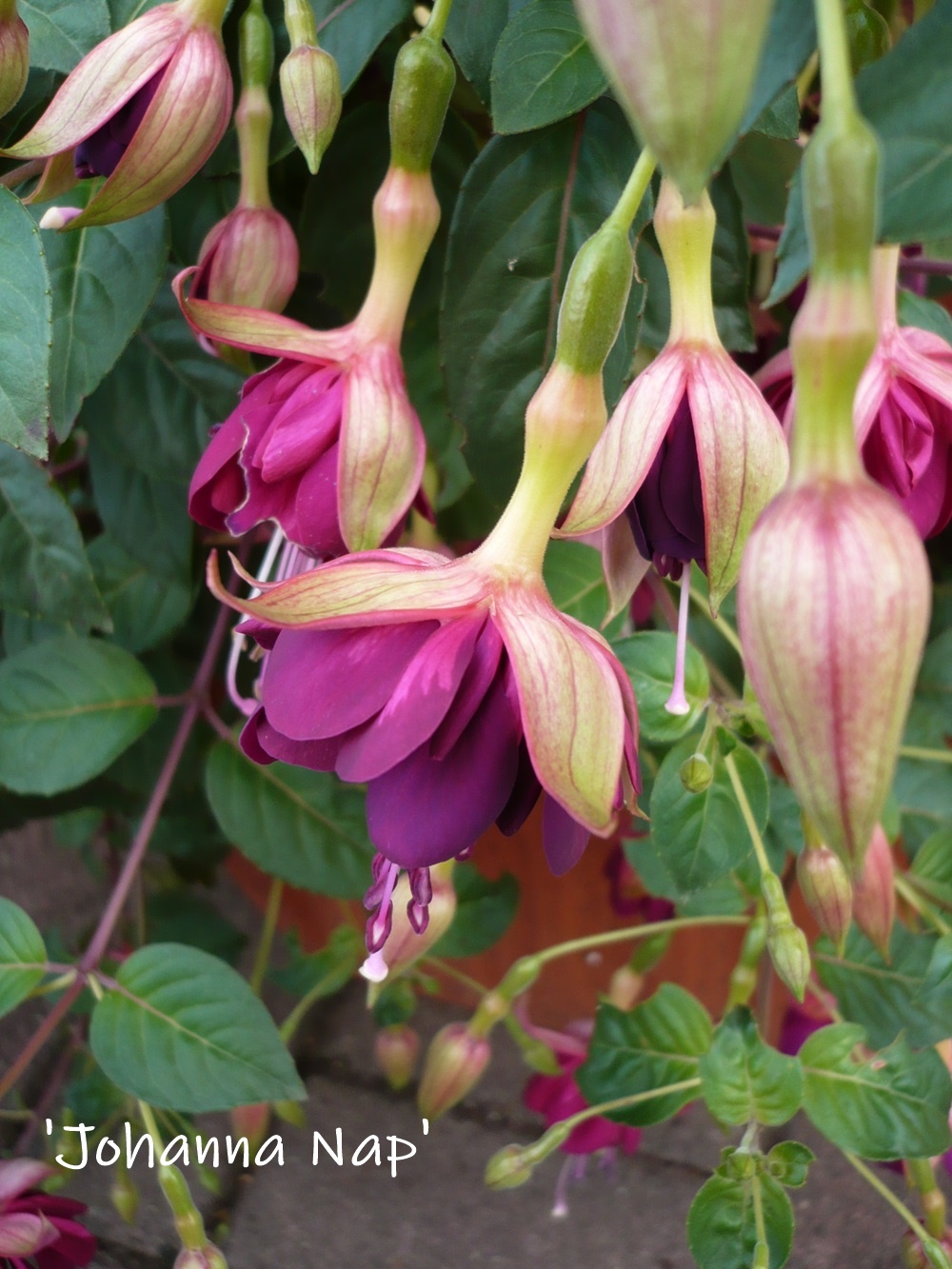 'Johanna Nap' ist eine Fuchsie mit hohem Wiedererkennungswert. Alleine die besondere Farbzusammenstellung ist bemerkenswert.