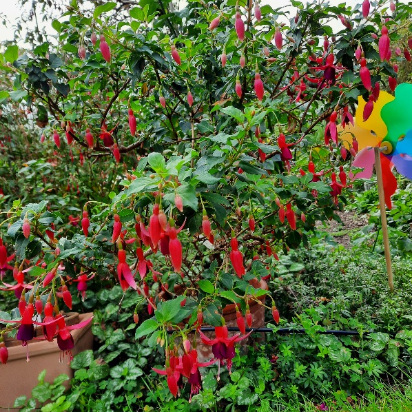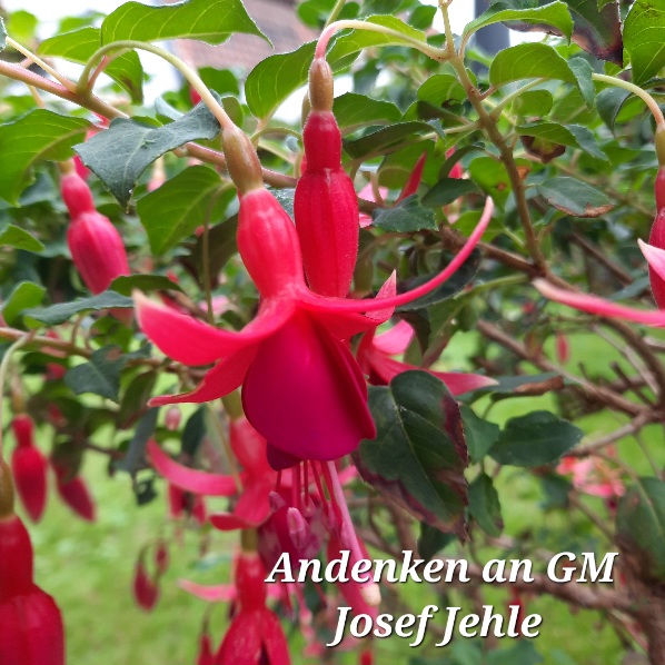 Ich habe die ' Hildegard Tausch' in der täglichen Fuchsienblüte vorgestellt. Sie ist vom Züchter Josef Jehle. Diesem Züchter hat Gunter Ganzhorn eine Fuchsie gewidmet. Es ist eine sehr schöne reichblütige Fuchsie, die ich auch schon einige Jahre in meinem Bestand habe. Die rote Blüte leuchtet regelrecht in der Abendsonne. Sie wird nicht sehr groß, eignet sich auch sehr gut für die Pflanzung ins Beet. Bei mir füllt sie einen größeren Topf. Sie ist unkompliziert in der Pflege , überwintert gut und lässt sich auch gut über Stecklinge vermehren.