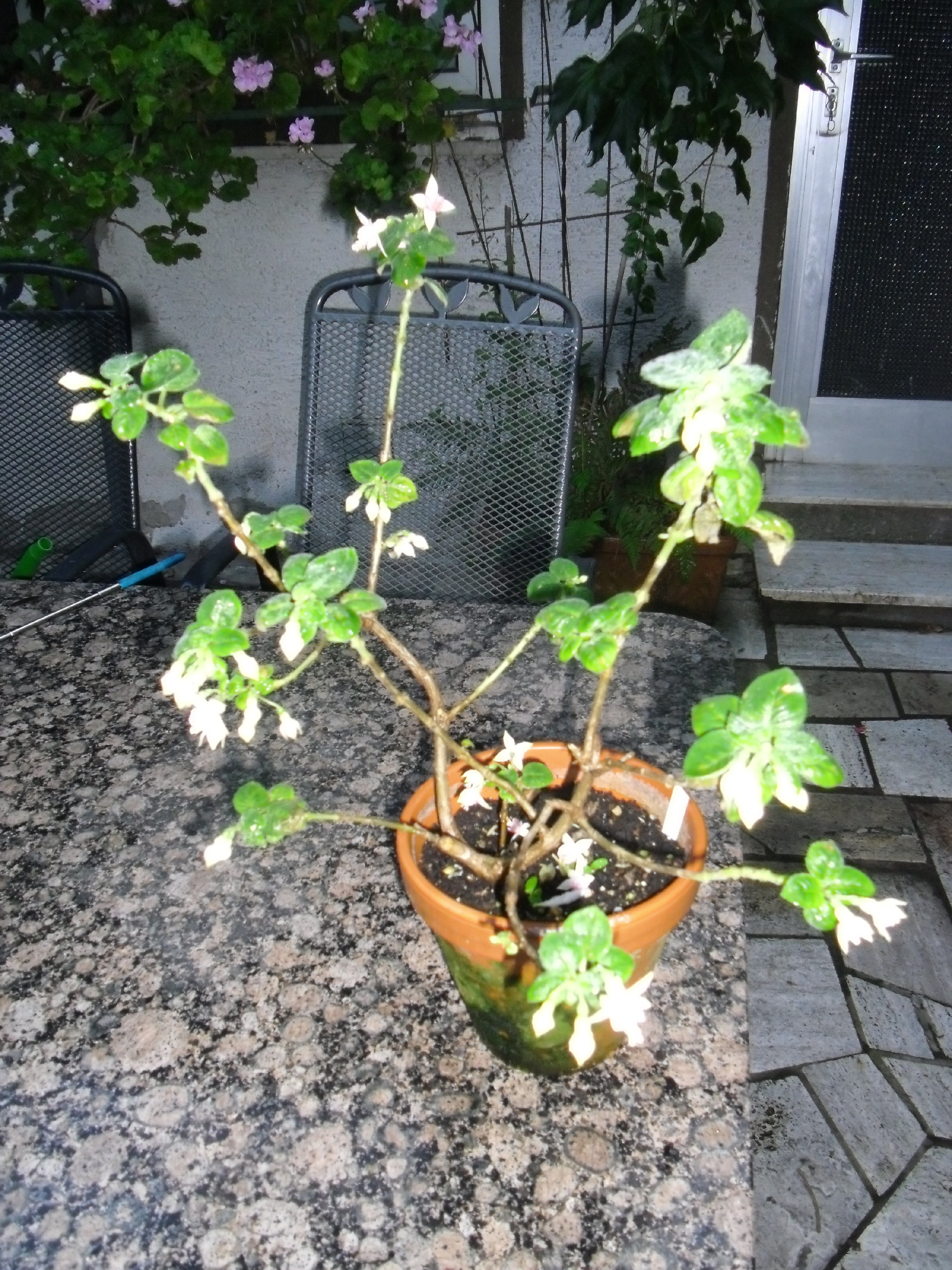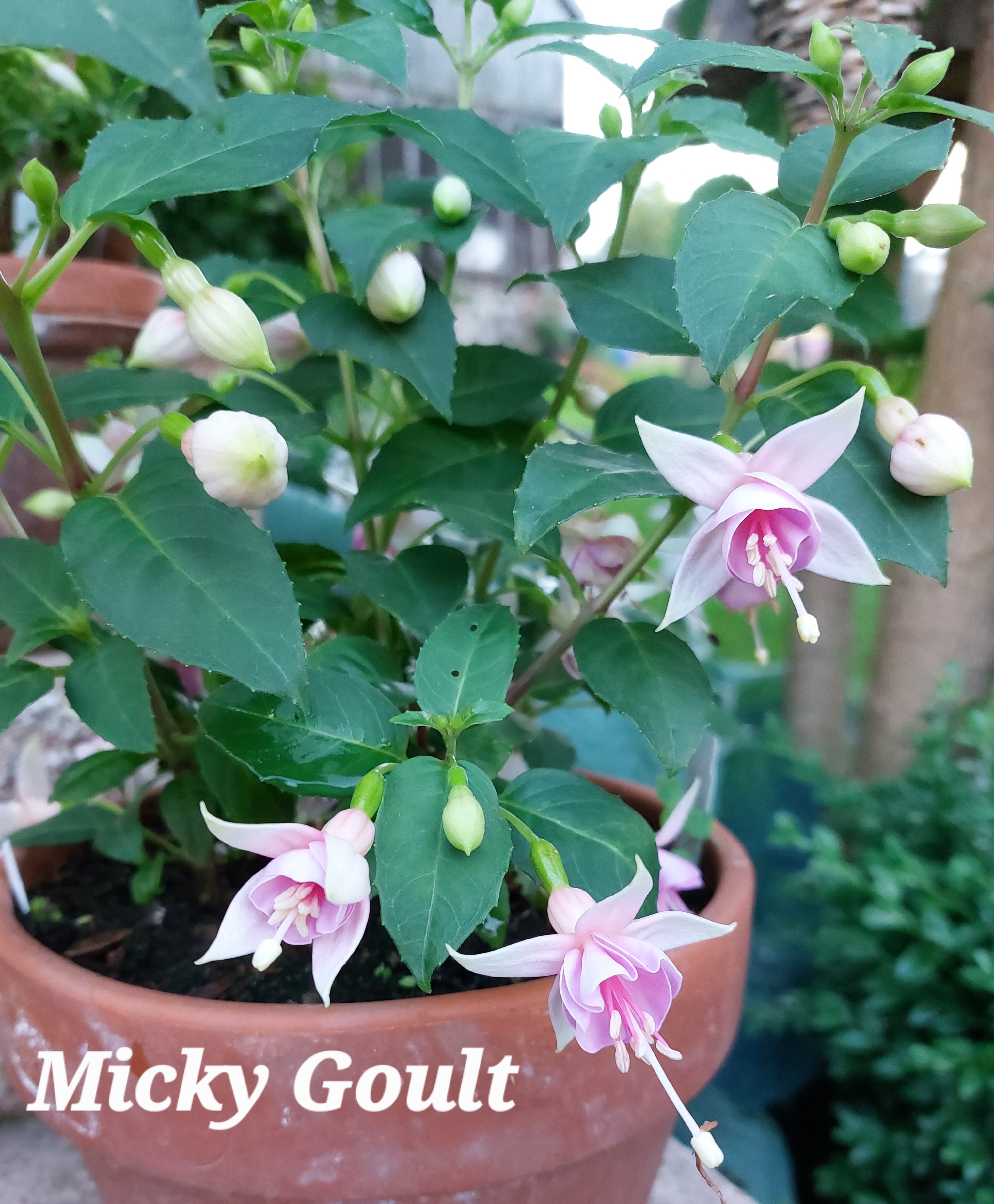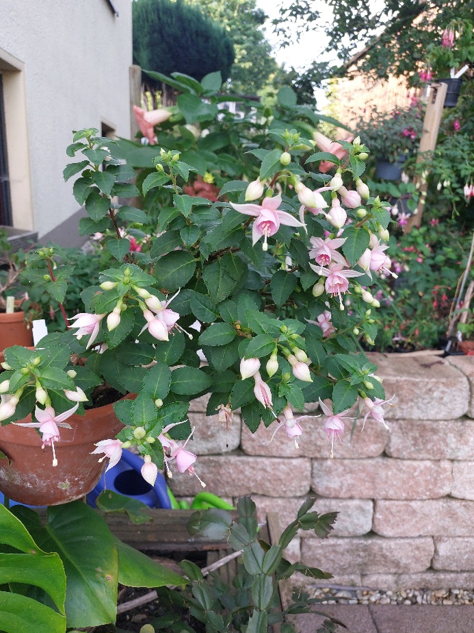 Meine Micky Goult lebt noch und hat dieses Jahr ohne Pause geblüht. Der Standort im Halbschatten gefällt ihr auch sehr gut. Leider ist das eine zugige Ecke so das die Fuchsie sehr schief steht. Nächstes Jahr beim umtopfen wird sie wieder gerade gerückt und bekommt einen Stab.