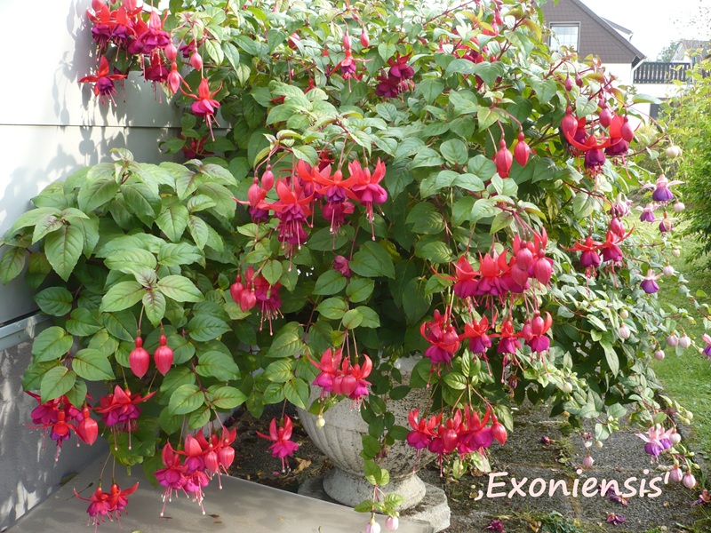Die ' Exoniensis' habe ich schon ganz viele Jahre. Ich hatte sie mal bei Rosi Friedl bestellt. Sie macht schon viele Jahre keinen Versand mehr. Und es ist immer noch meine erste Pflanze. Sie hat also schon einige Jahre auf dem Buckel. :D Ich habe sie in einem großen Topf. Aber es ist ein Spätblüher, sie fängt bei mir immer erst im Spätsommer zu blühen an, dann aber bis zum Frost. Mir gefallen auch die dunkelroten Blüten. Eigentlich wollte ich mir in diesem Jahr eine neue Pflanze ziehen, weil ein alter Ast weggetrocknet ist im letzten Jahr. Jetzt kommt aber frisches Grün aus der Basis. Also bleibt meine alte Lady am Leben. :lol: