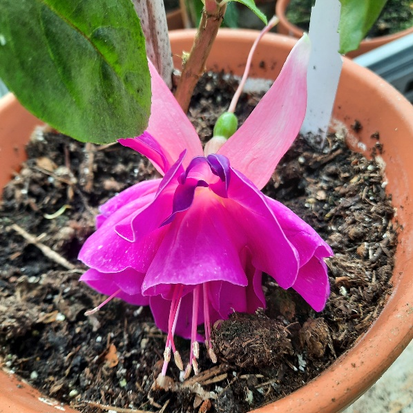Es ist eine starkwüchsie Fuchsie in zartlila,rosa, sie wächst aufrecht bis überhängend. Die Blüte ist beim Aufblühen in zartem hellblau und verfärbt sich zu lila. Ich habe die aufgeblühte Blüte mal von unten fotografiert. Sie füllt den ganzen Topf aus. Da sieht man wie groß sie aufgeblüht ist.