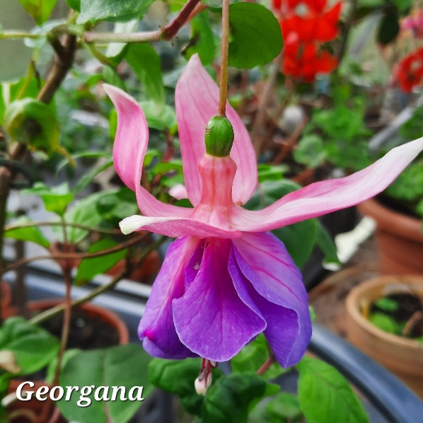 Ich bin in einem Bericht im Fuchsienkurier von Waltraud Köhler auf die 'Georgana' gekommen. Darum habe ich sie mir bestellt. Und sie ist wirklich hübsch . Ich hatte sie erst mit weiteren Stecklingen in einem Blumenkasten. Die waren alle so üppig gewachsen, dass ich sie im Sommer in einzelne Töpfe gesetzt habe. Das hat sie mir übel genommen und die großen Blätter haben geschlappt. Schnell habe ich kräftig zurück geschnitten. Das hat sie gerettet, dafür aber erst spät geblüht. Aber das Warten hat sich gelohnt.