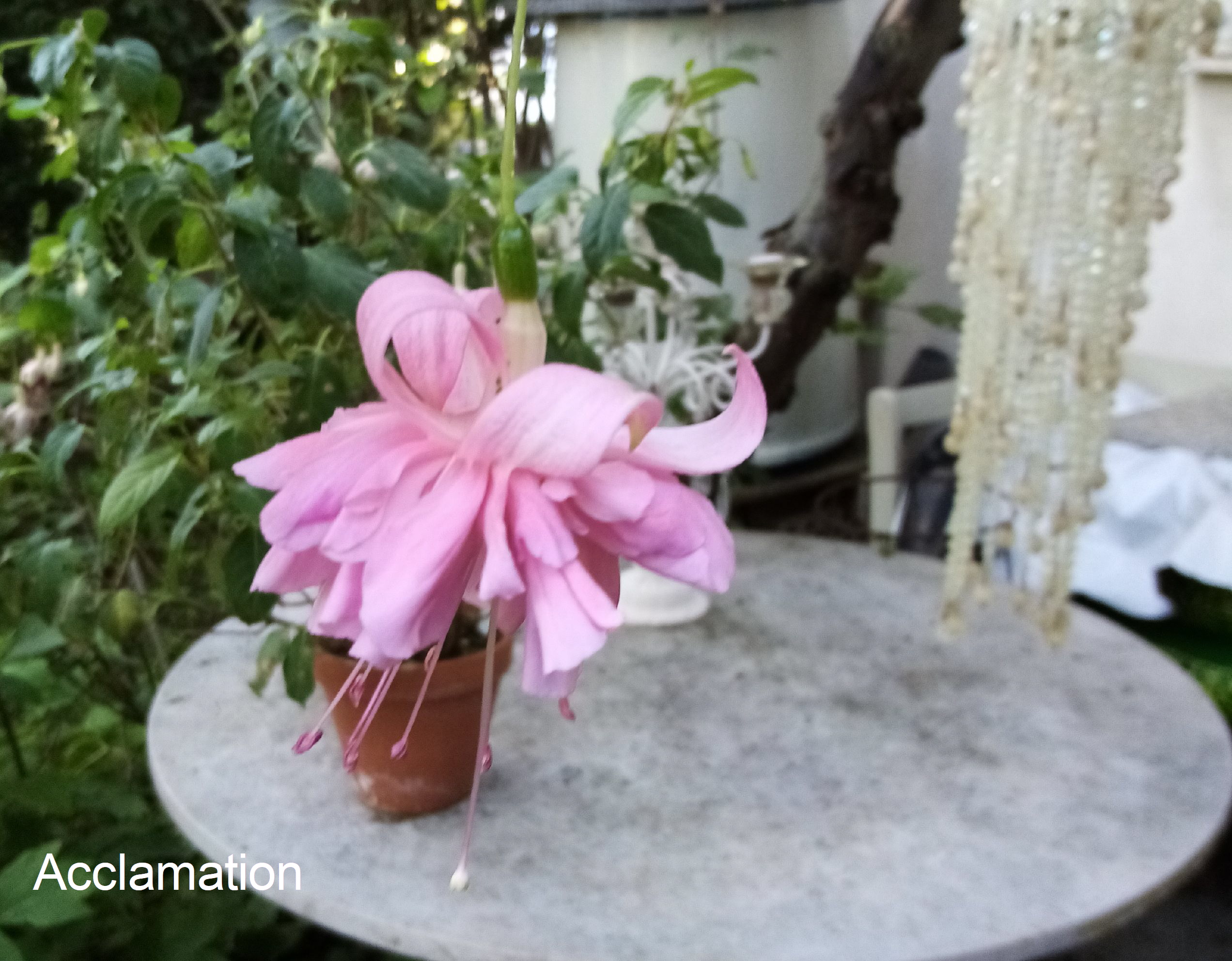 Eine schöne reinrosafarbene Fuchsie gefüllt und reichblühend.Mit Wasser muß man sehr vorsichtig sein das mag sie nur in begrenzten Mengen.Ganz schnell hat man sie vergossen.Sonne mag sie sehr was bei diesen Sorten eher selten ist.