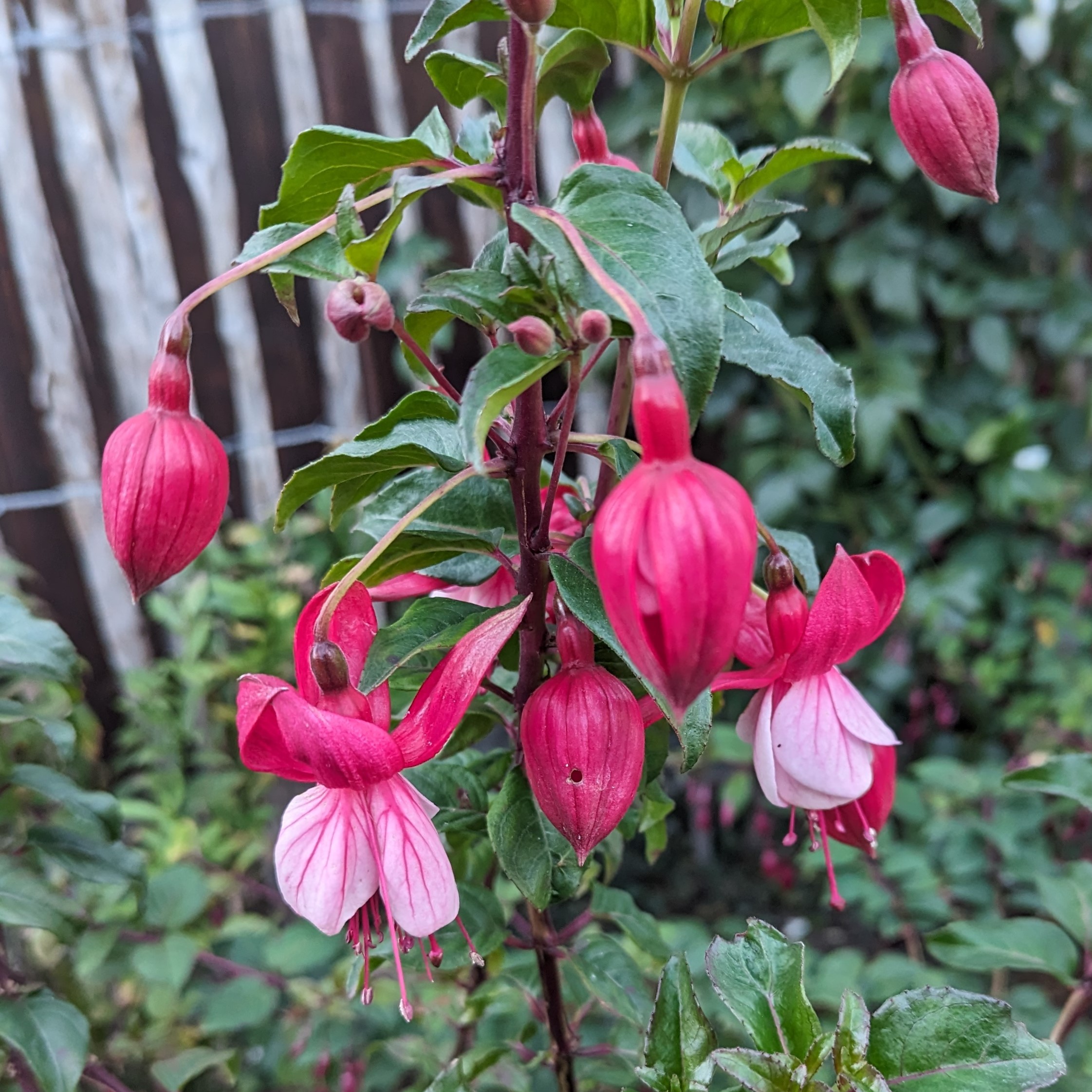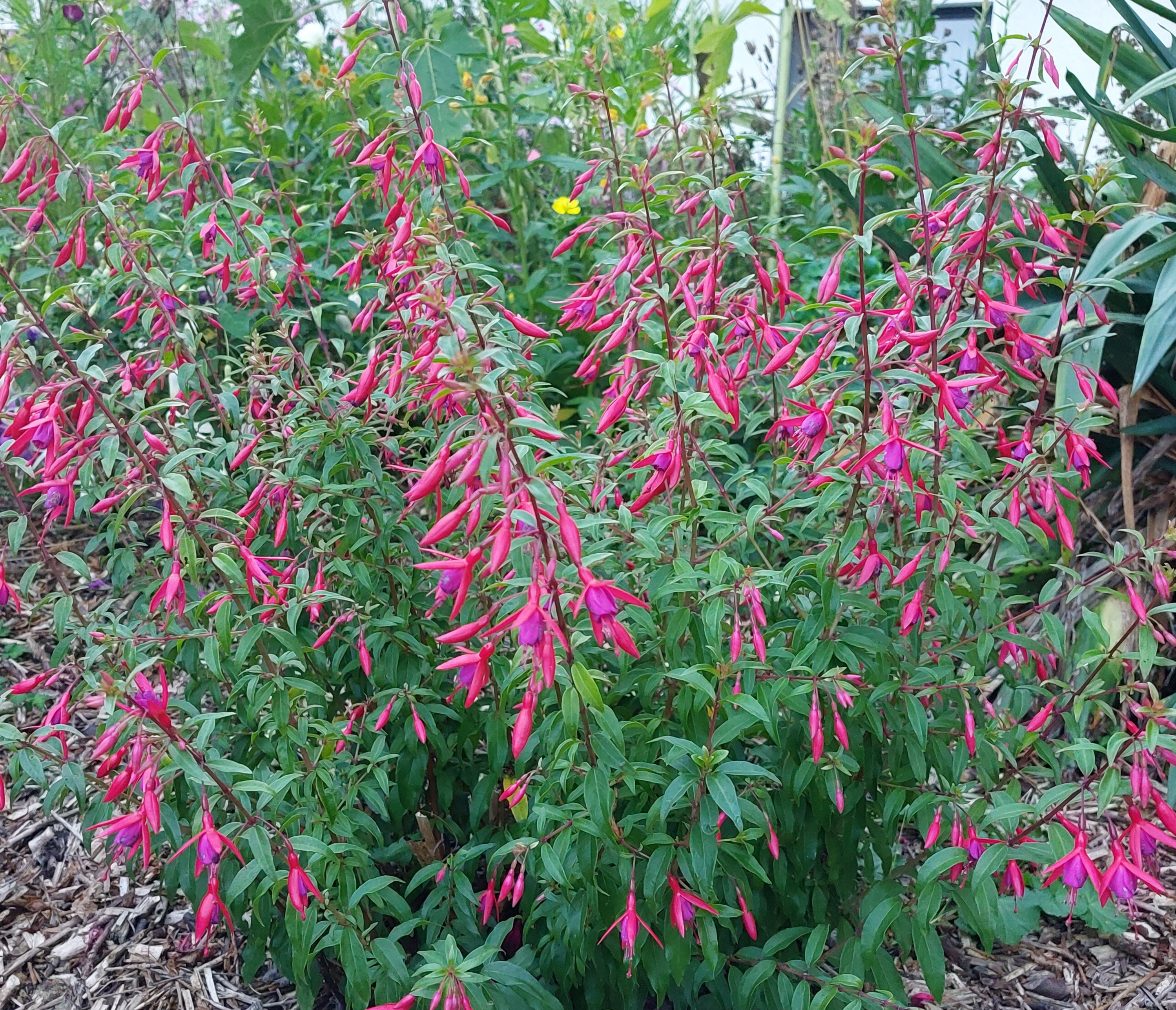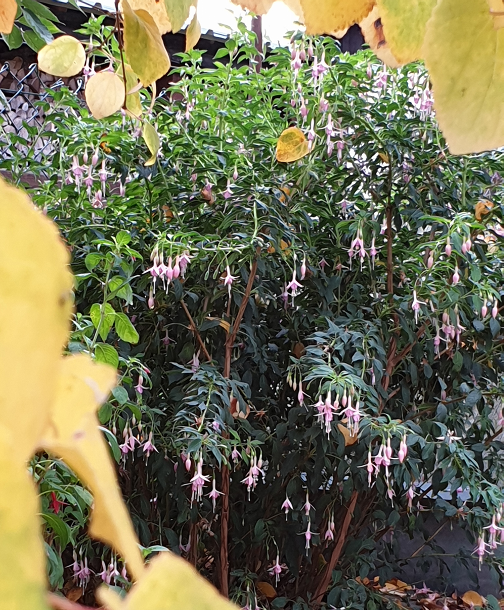Das ist das Tolle an winterharten Fuchsien, ich mache mir um wenige Grade keine Gedanken, erst wenn es richtig friert, dass man es an den Blüten sieht, schneide ich die großen bis auf 20 - 30 cm runter und mache Holzstecklinge. Und wenn jemand Wünsche hat muss er das vorher schreiben, denn ich schneide nicht Holzstecklinge von über 100 Pflanzen und hinterher will sie keiner.