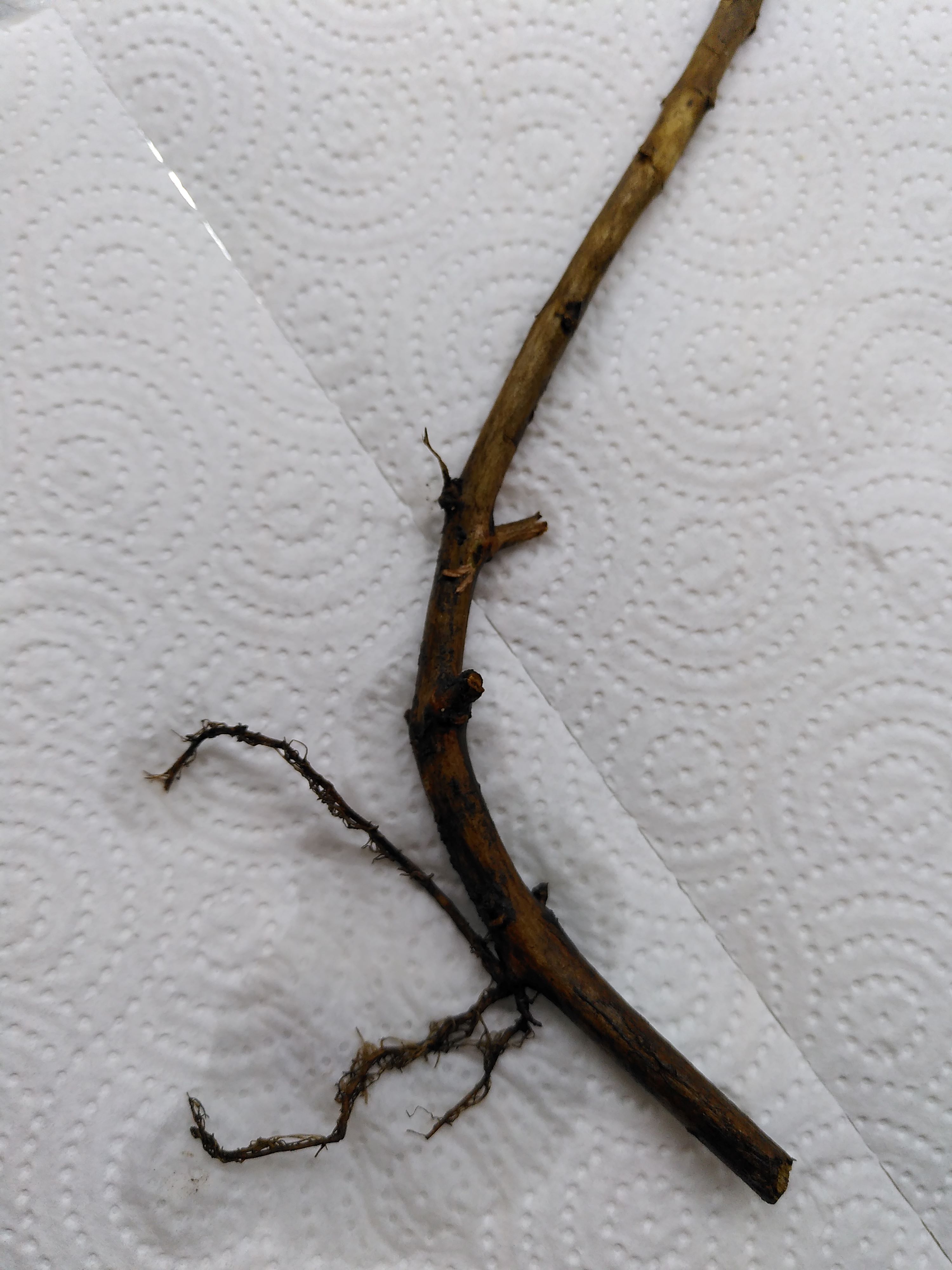 am Sonntag hatten wir unsere winterharten Fuchsien zurück geschnitten und abgedeckt. Dabei kam so aus dem Hintergrund ein Absenker der Rose of Castile Improved zum Vorschein, schon gute 30 cm lang.