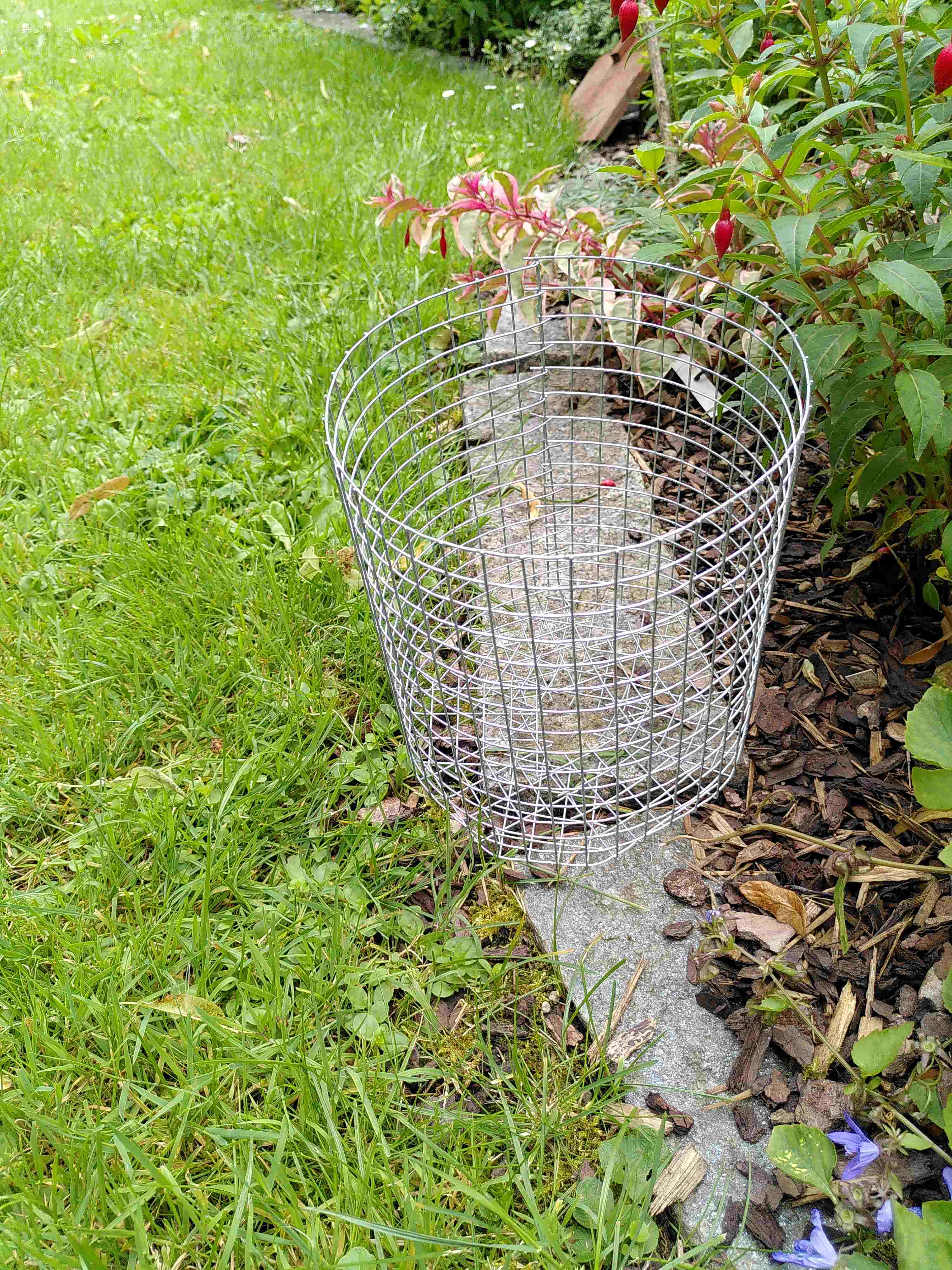 Hallo Bettina, Du hattest nach Auspflanzkriterien gefragt: Die Lauchefeld hatte ich vor 6 Wochen in einem 9er Topf in Wemding gekauft; zuhause umgepflanzt und jetzt war der 13er Topf schon wieder gut durchwurzelt, von unten sah man die weißen Wurzeln. Die Zweige waren unten schon etwas hölzern geworden, das ist ein gutes Zeichen für die Auspflanzreife, ohne ein Risiko einzugehen. Um auch das Risiko des Wühlmausschadens abzuwenden, pflanze ich die Fuchsien immer in selbstgemachte Drahtkörbchen. Das ist verzinkter Draht, hält ein paar Jahre. Die Wurzeln wachsen zwar schon nach einem Jahr gut durch das Gitter, aber das Wurzelherz ist geschützt.