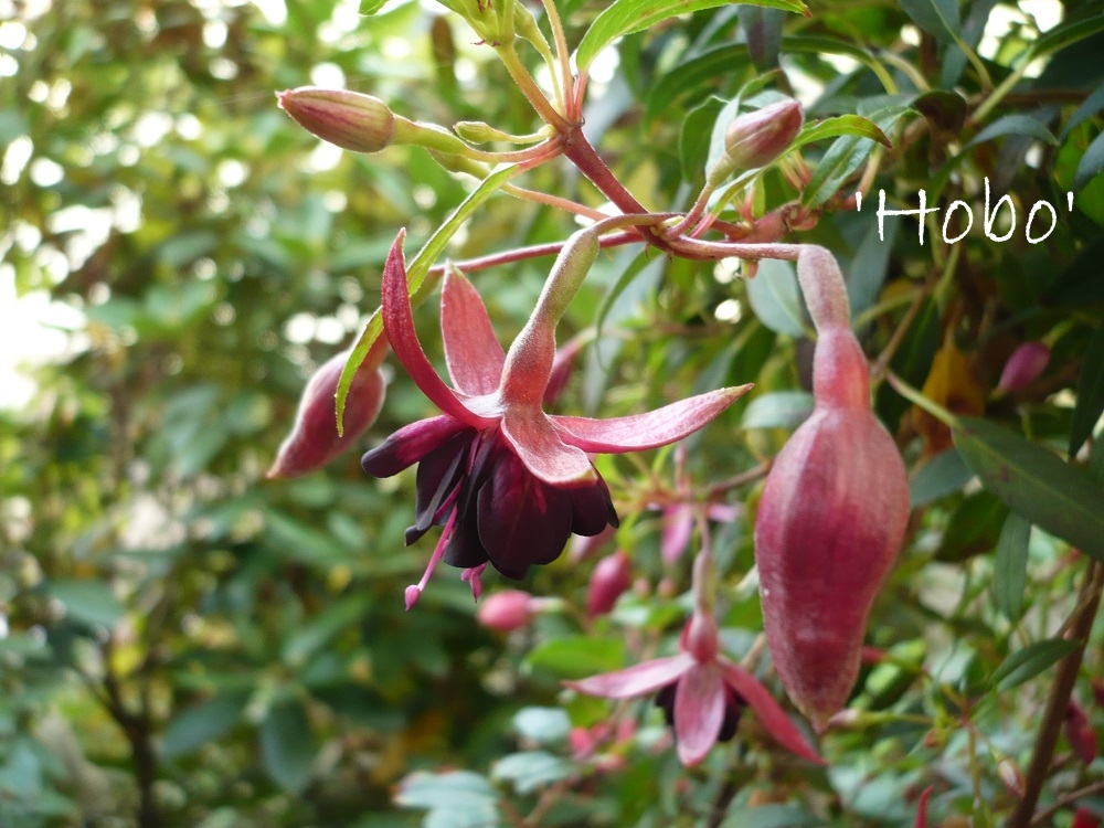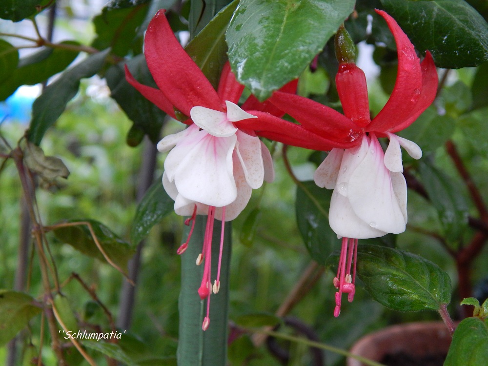 'Hobo', da hatte kürzlich Hergard danach gefragt. Die gefüllten Blüten sind daumennagelgroß. Alleine dieser Anblick ist schon besonders. 'Horst Konrad' Form und Farbe sind für mich ein Knaller. Wunderschön! Und eine besondere leuchtende Farbe hat auch de 'Thüringia' die ich mal vom FK Harz bekam. So schön... 'Dirk van Deelen', da darf ich garnicht dran denken...so eine tolle Fuchsie, hatte ich als kleinen Hochstamm. Und auf einmal (schleichend in der Saison besser gesagt) kümmerte sie und überlebte den Winter nicht. Schade! Ein ganz besonderes Schätzchen ist die 'Schlumpatia'. Insgesamt eine zierlich wirkende Fuchsie, die reichlich blüht und ganz besondere Blüten hat.