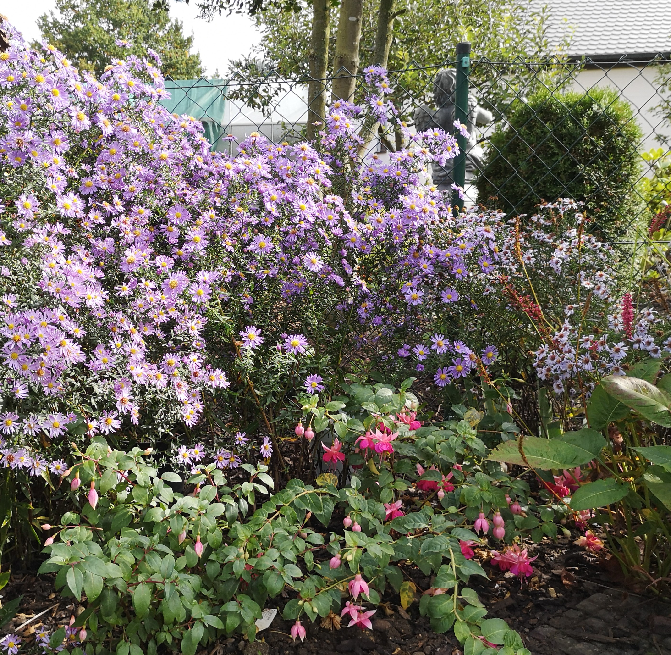 Jetzt freue ich mich noch mal richtig über meine Winterharten, jeden Tag schaue ich! Sicher fallen auch bei ihnen schon viele Blüten und Blätter, aber sie sehen doch noch gut aus. Neben den vielen blauen Astern die herbstlichen roten Farbflecken