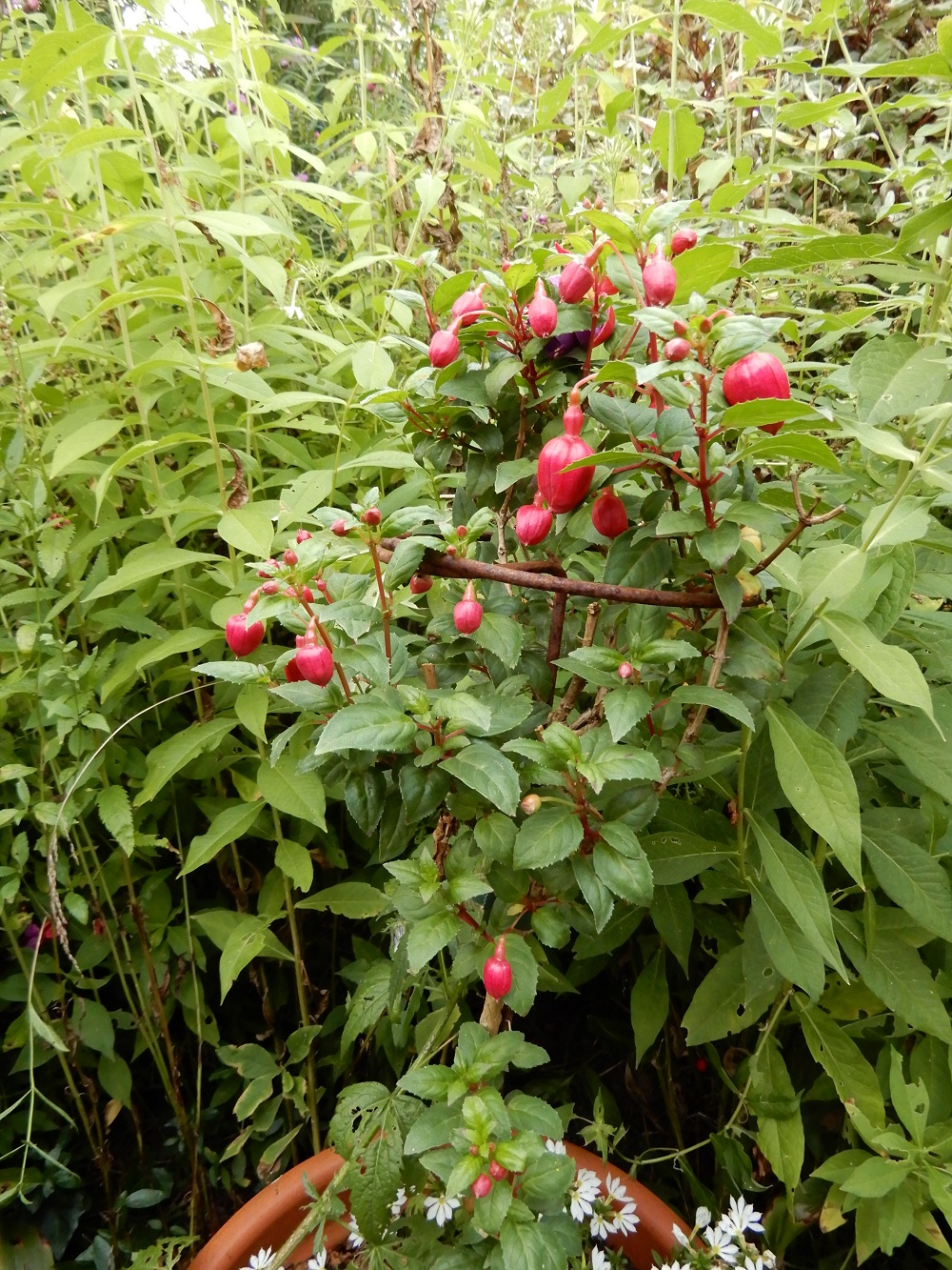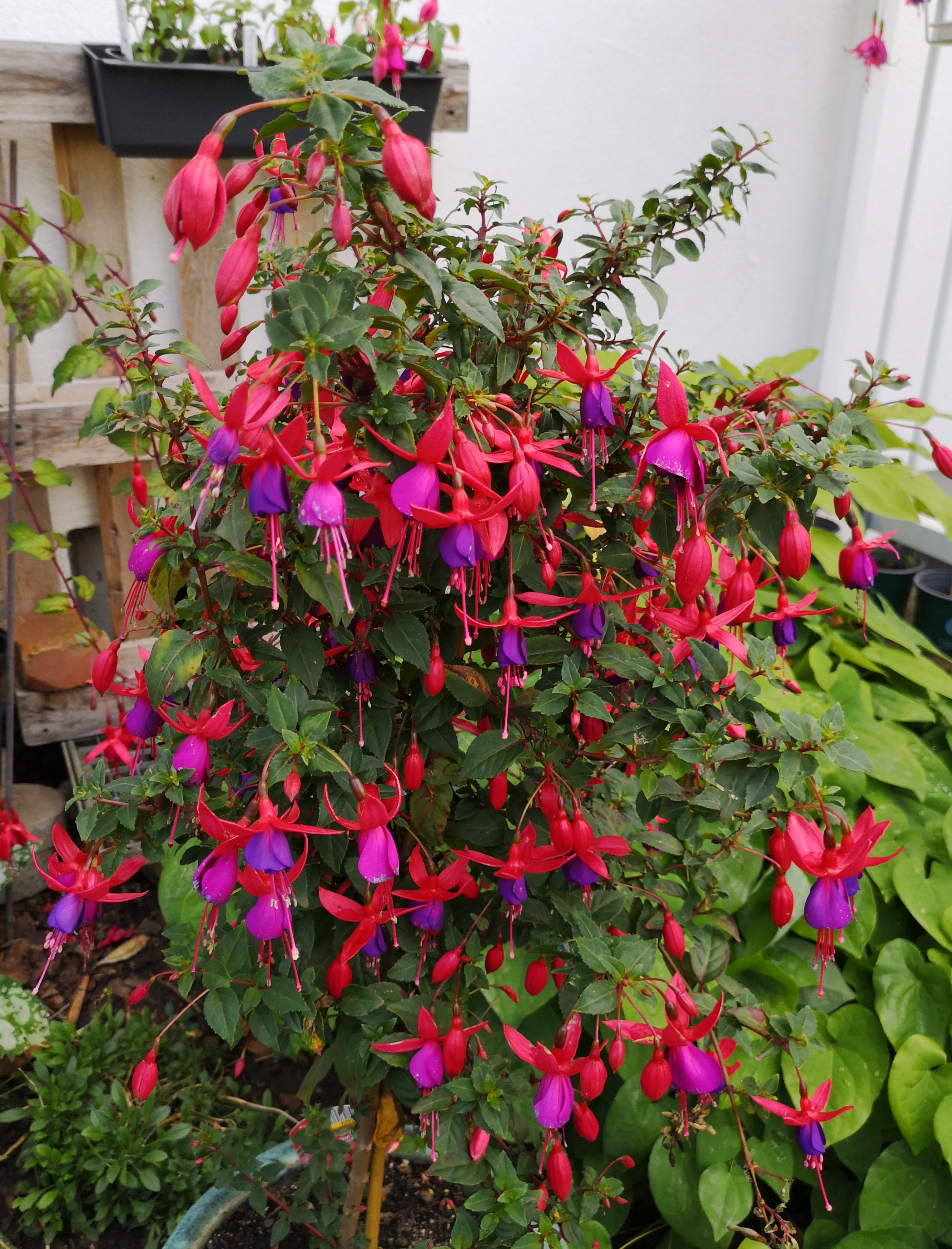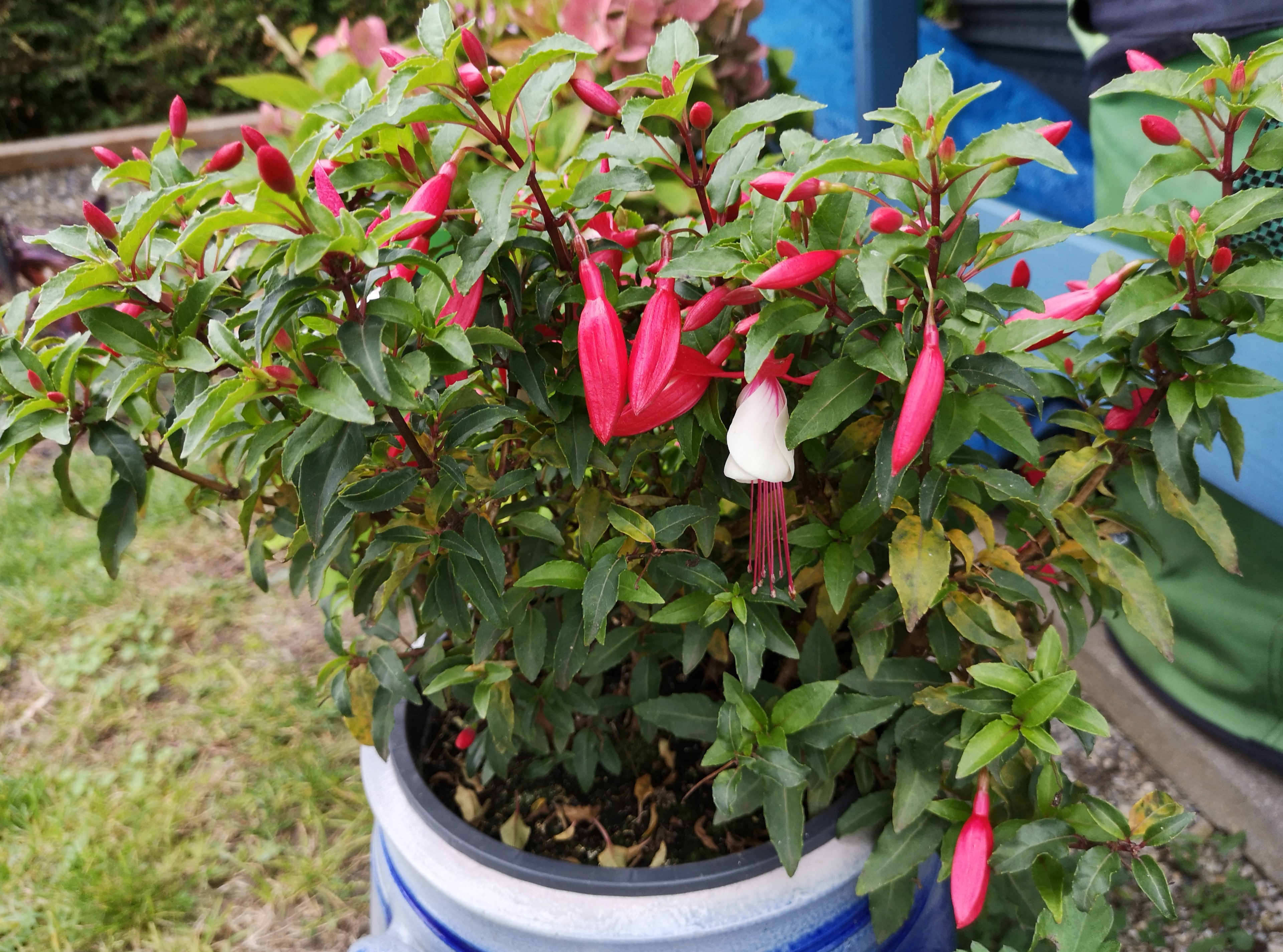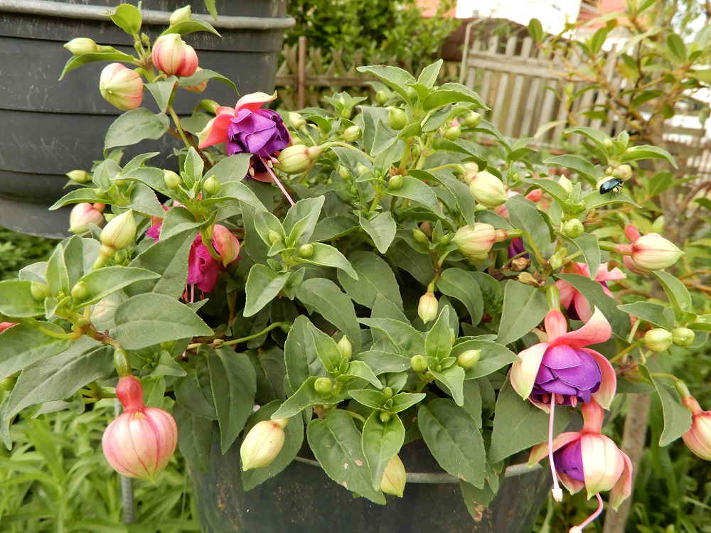 Ich habe noch eine Baumarktfuchsie gefunden. Sie steht in einem großen Topf und wäre bald vertrocknet, ein wenig Aufmerksamkeit und schon sagt sie danke! Ich meine, ich hatte sie im letzten Jahr in einem großen Kübel mit anderen und meinte es wäre eine winterharte, weiß aber nicht mehr welche. Vielleicht im nächsten Jahr!