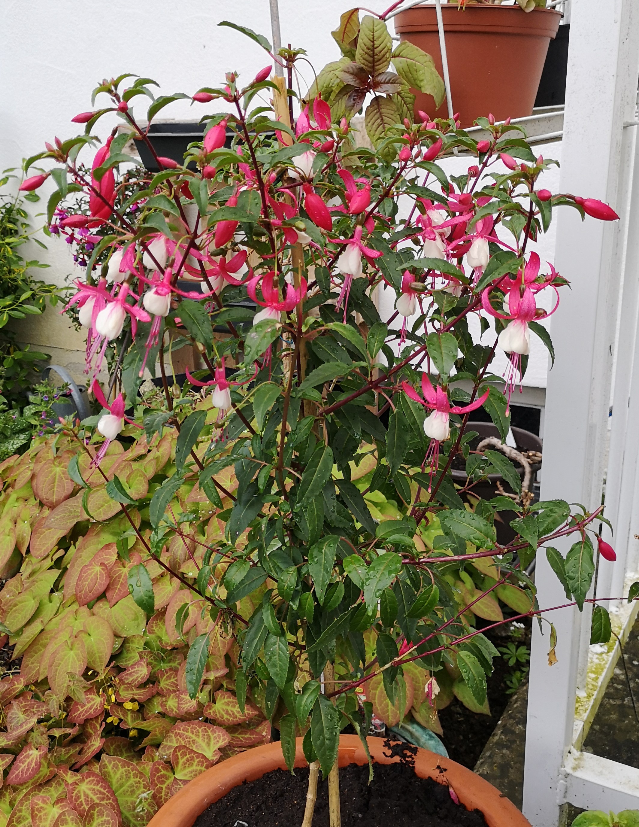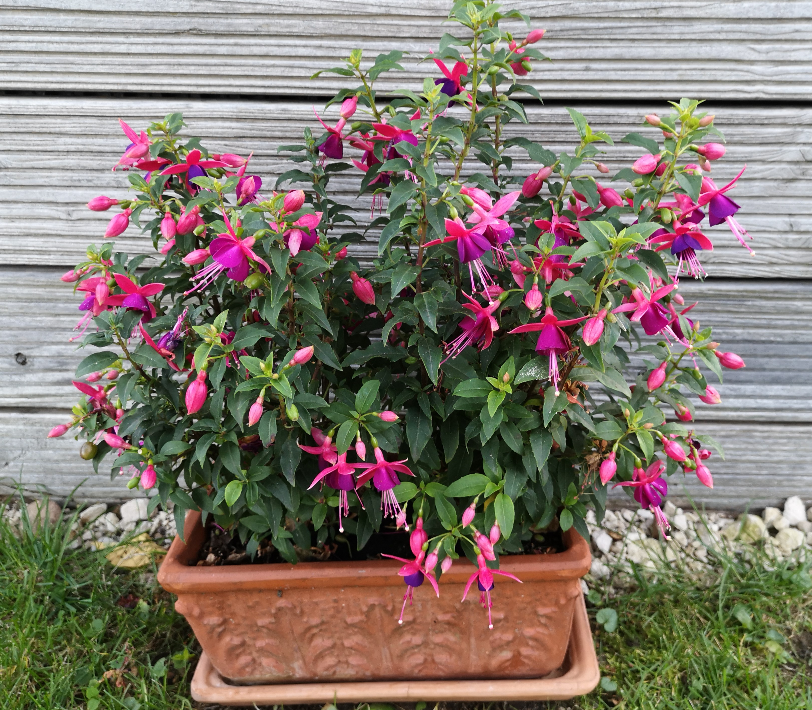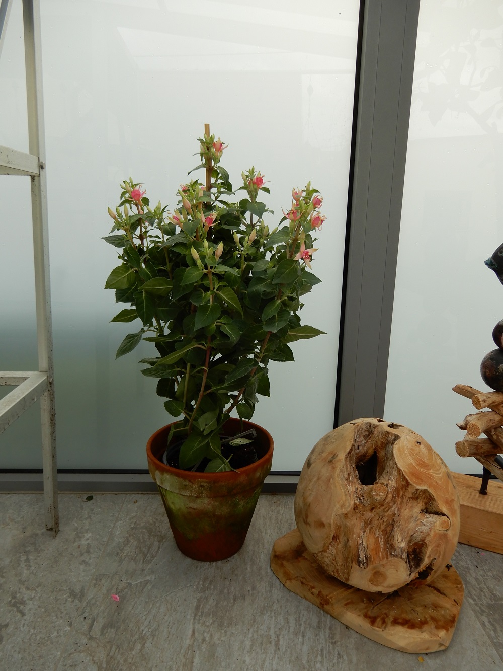 Ich habe noch eine Baumarktfuchsie gefunden. Sie steht in einem großen Topf und wäre bald vertrocknet, ein wenig Aufmerksamkeit und schon sagt sie danke! Ich meine, ich hatte sie im letzten Jahr in einem großen Kübel mit anderen und meinte es wäre eine winterharte, weiß aber nicht mehr welche. Vielleicht im nächsten Jahr!