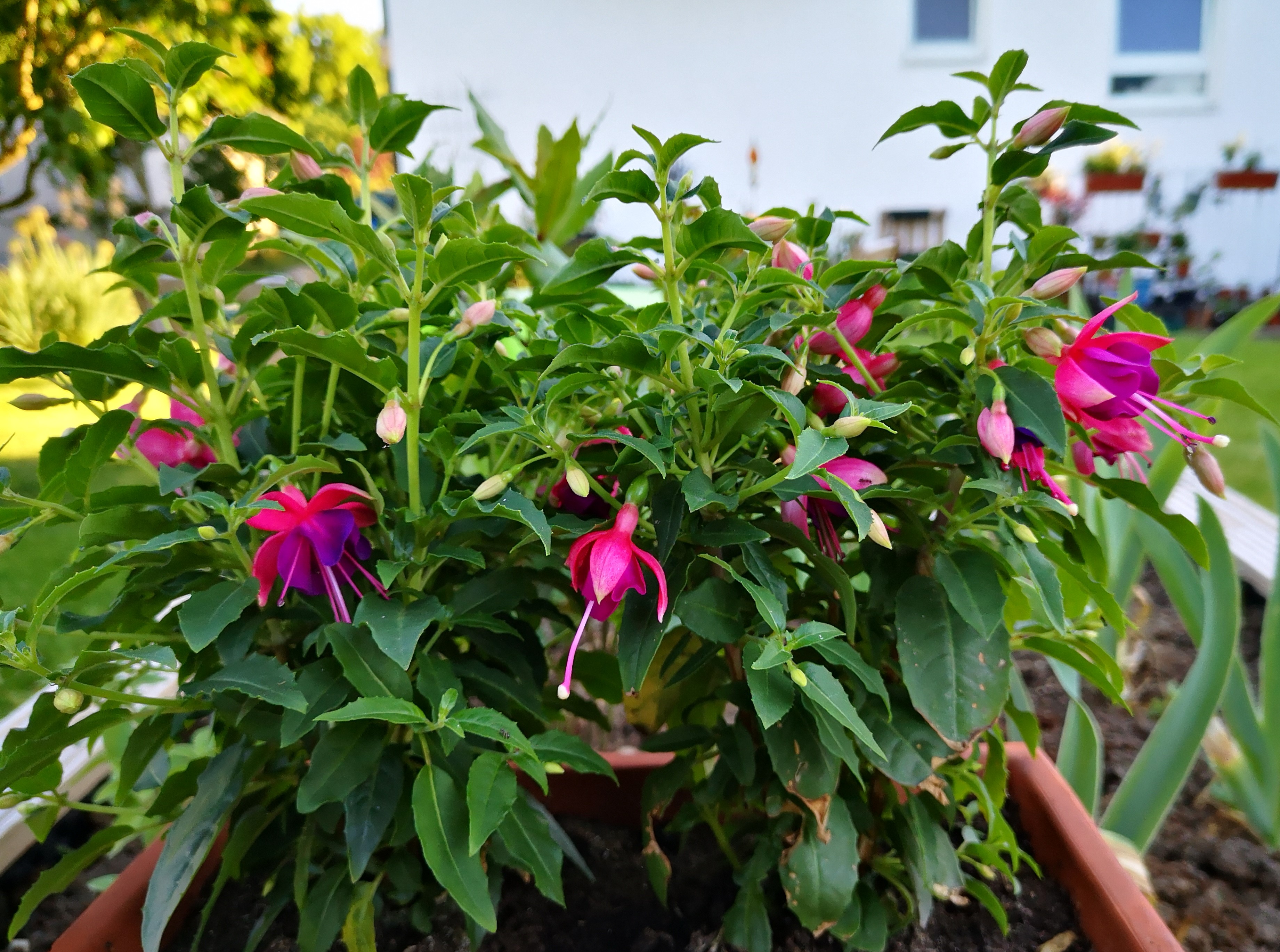 Heute war ich nur kurz im Garten, um die neu eingetopfte Baumarktfuchsie Angela zu fotografieren und die Lambada habe ich ins Beet gesetzt!