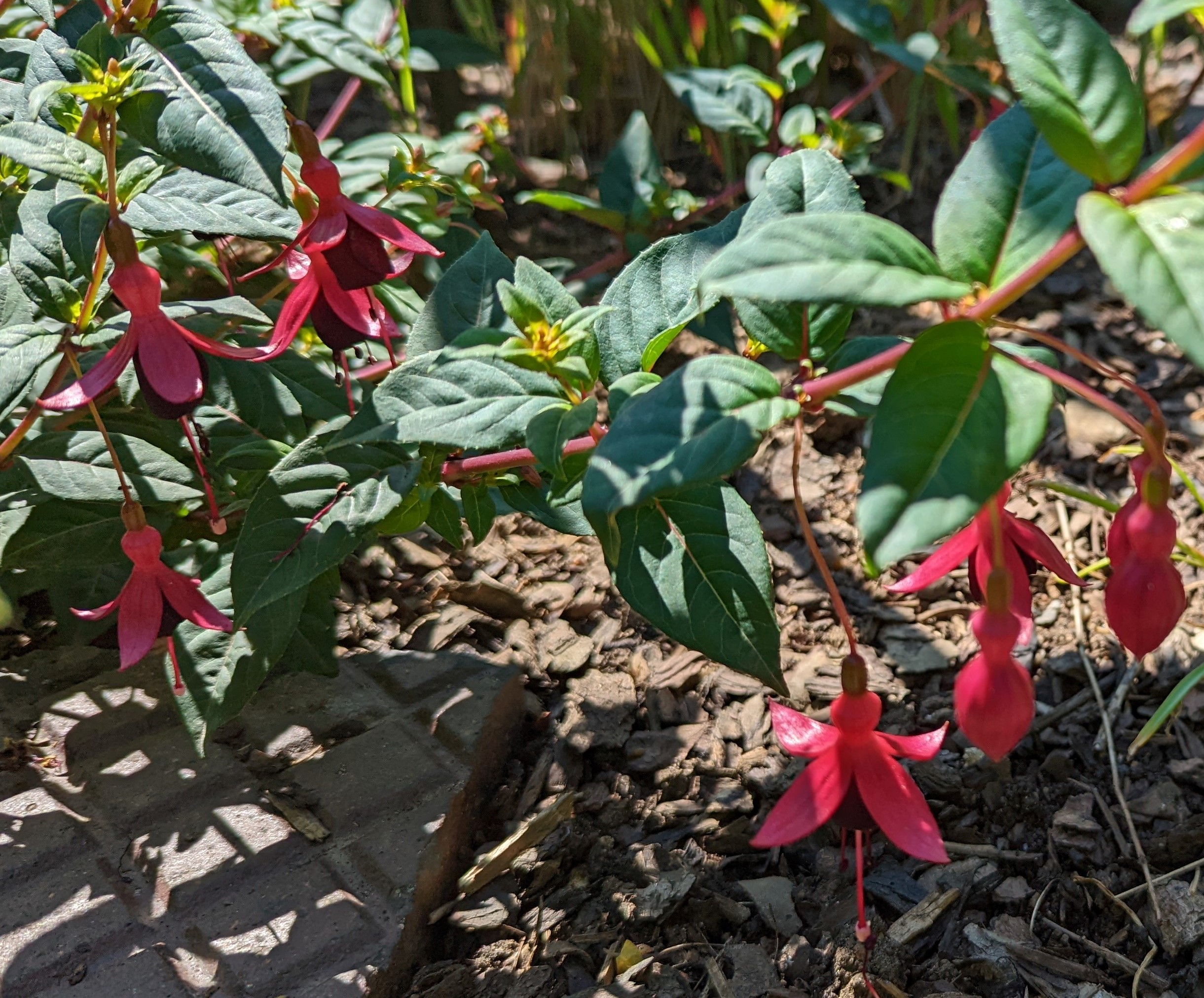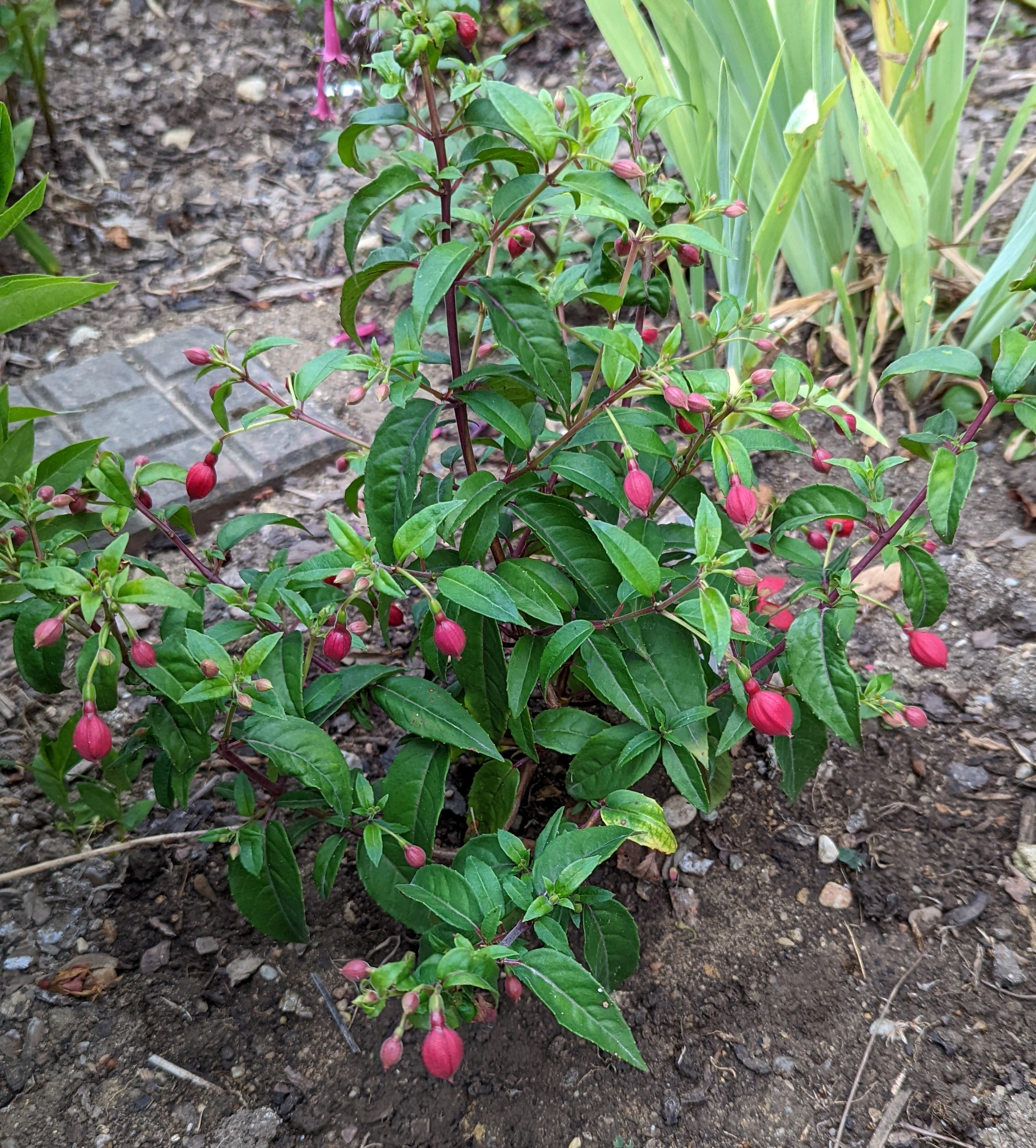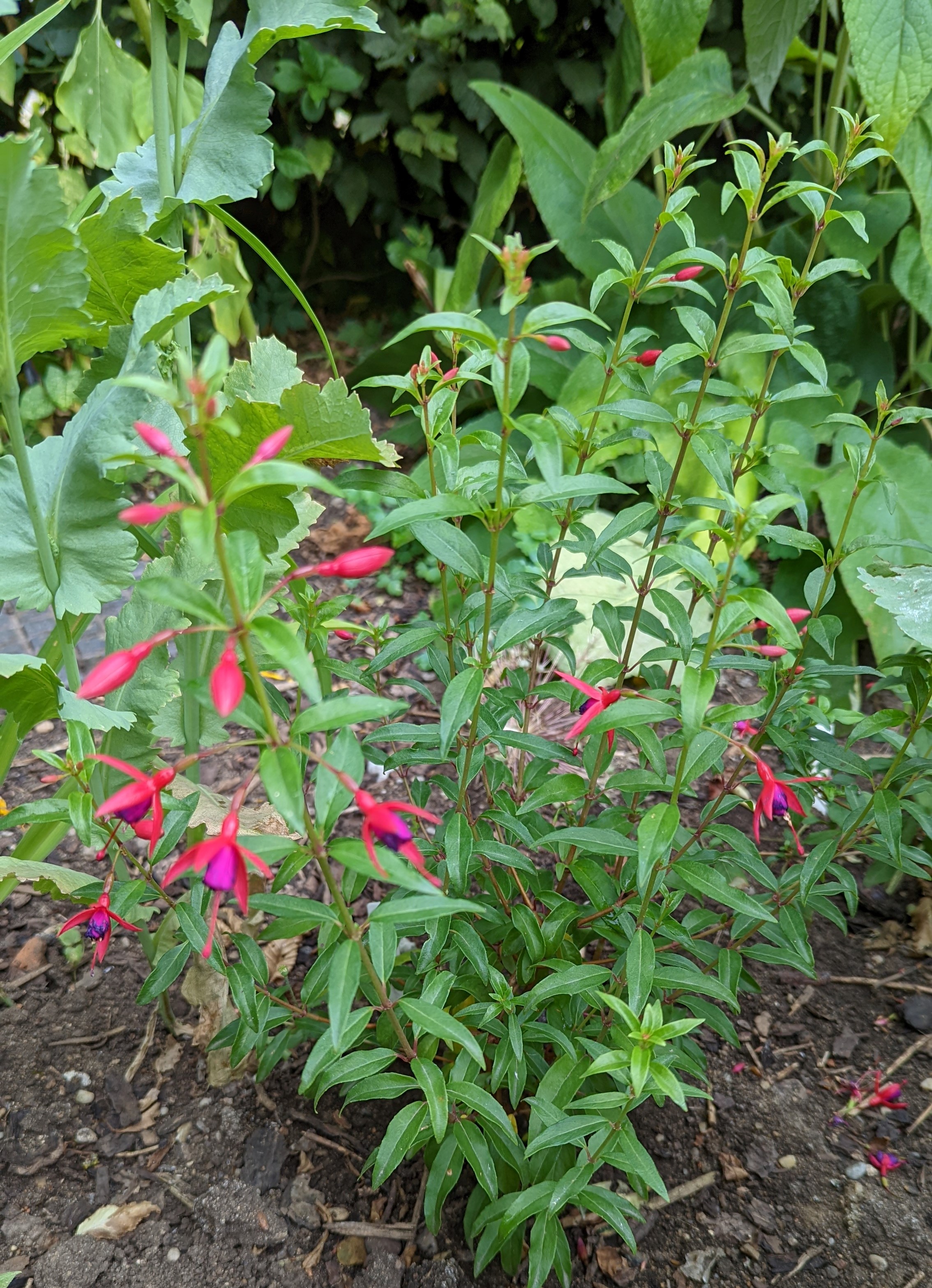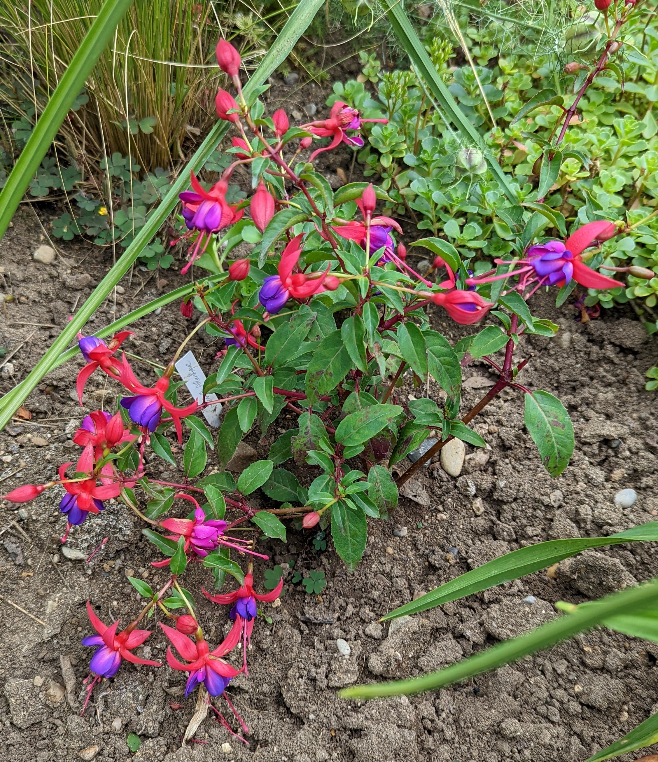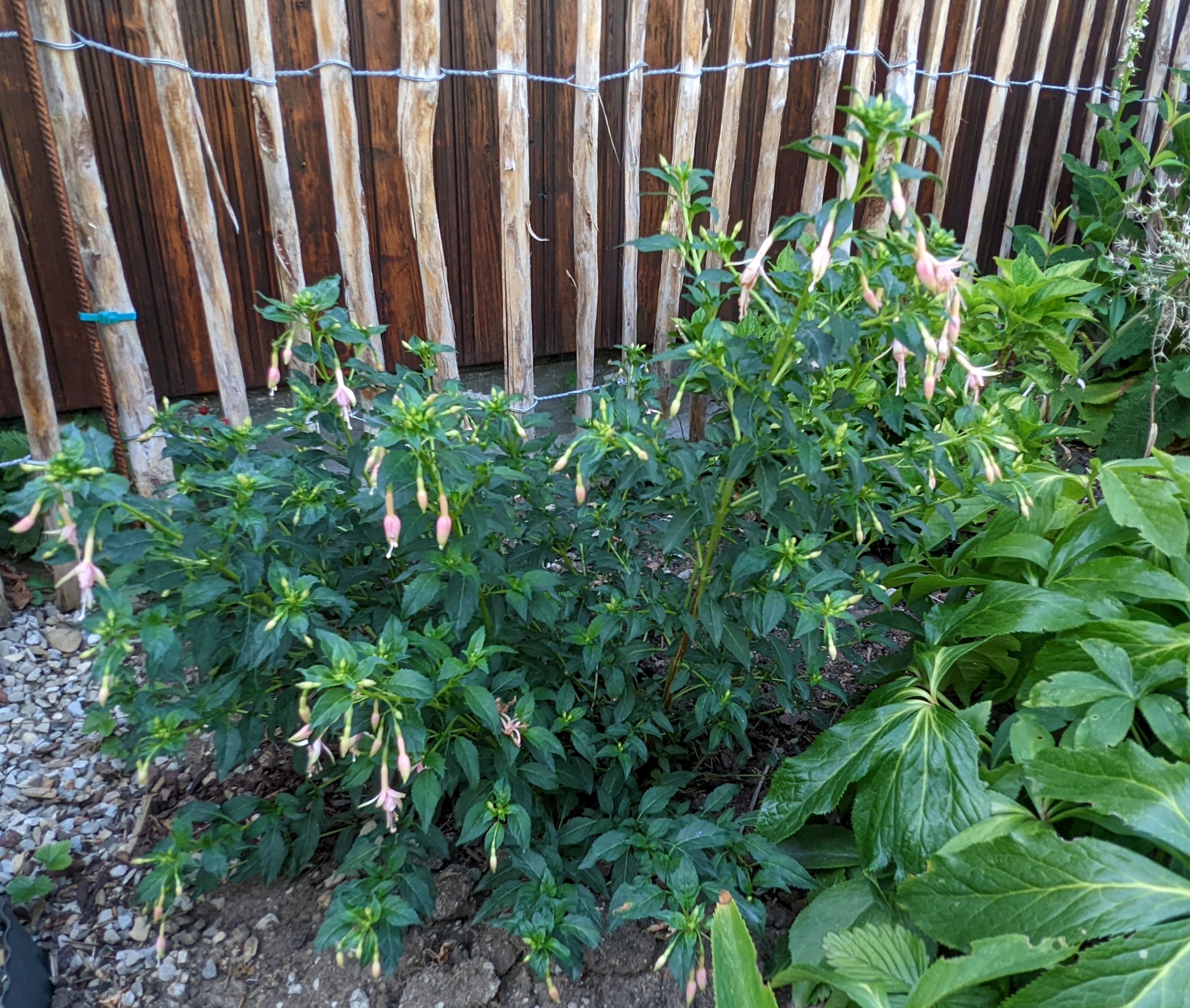 Mein Boden ist auch ziemlich lehmhaltig, aber das mögen die Fuchsien doch eigentlich gerne!? Beim Einpflanzen kommt auch immer noch eine Handvoll guter Erde mit ins Pflanzloch und das kräftige Angießen muss auch sein. Die Grayrigg hatte ich im vergangenen Jahr umgepflanzt, anfangs wurde sie tagsüber immer schlapp und ich dachte, das geht nicht gut! Dieses Jahr ist sie die erste, die super gewachsen ist und viele Blüten trägt! Ernst Naschke zeigt auch schon eine Menge Blüten und bei Genii ist das die erste Blüte, sie sieht noch nicht so toll aus, finde ich! Gracilis habe ich im Frühjahr umgesetzt, sie kämpft auch noch mit ihrem neuen Platz, sie ist noch nicht so hoch wie die letzten Jahre!