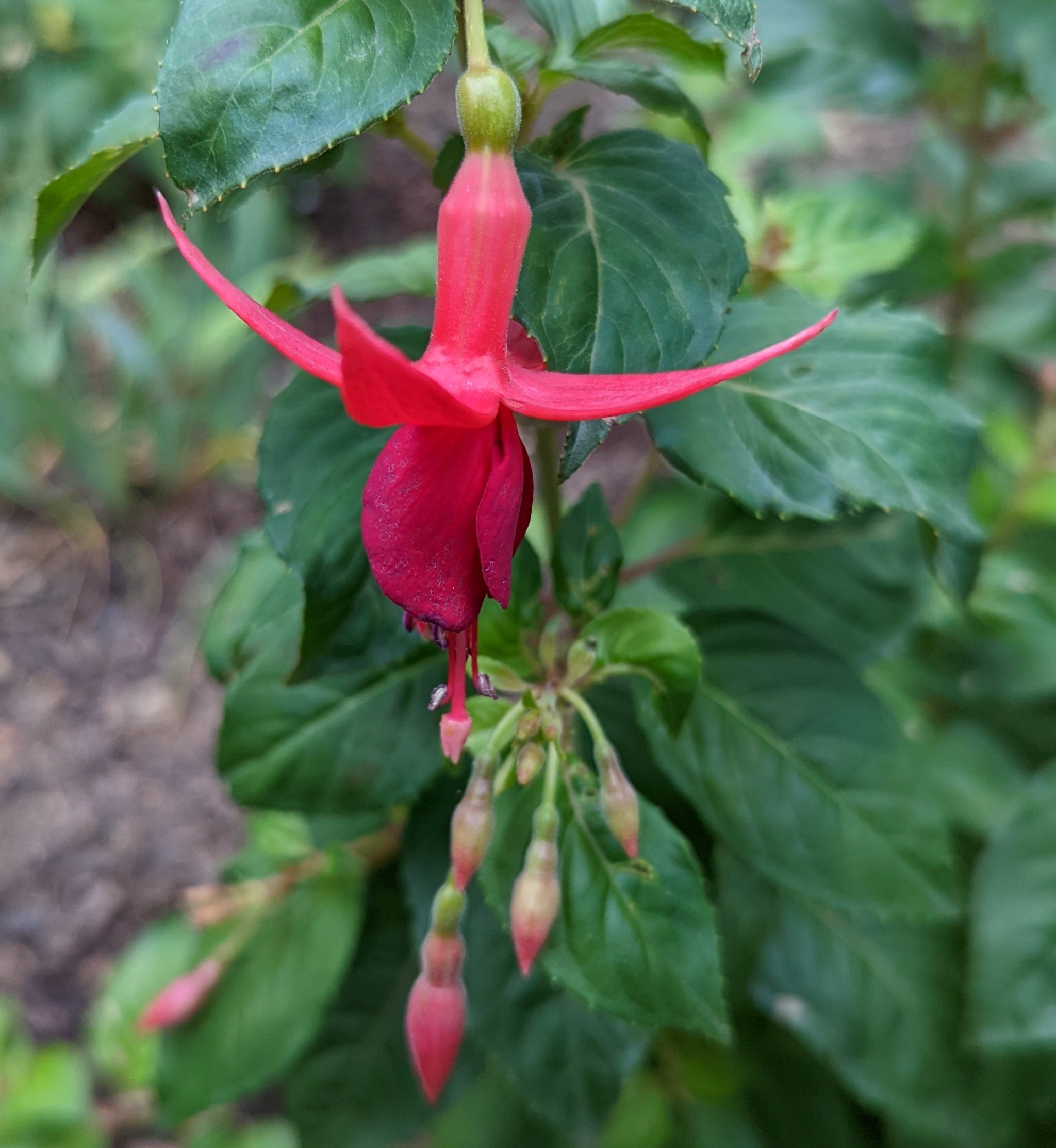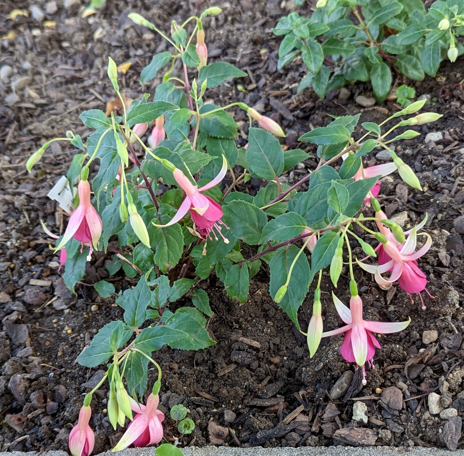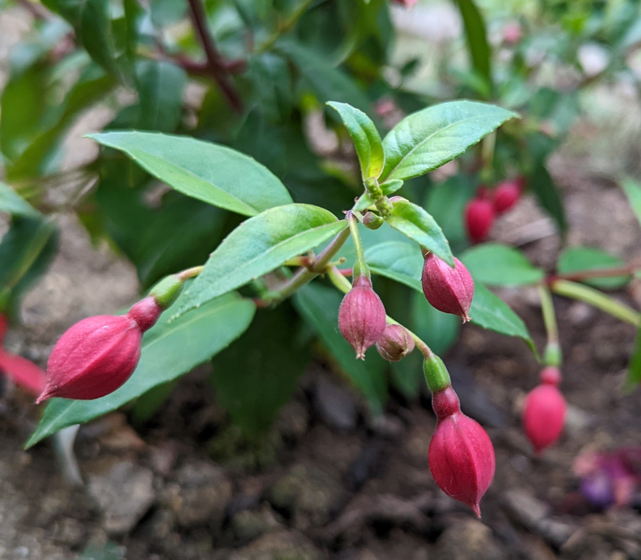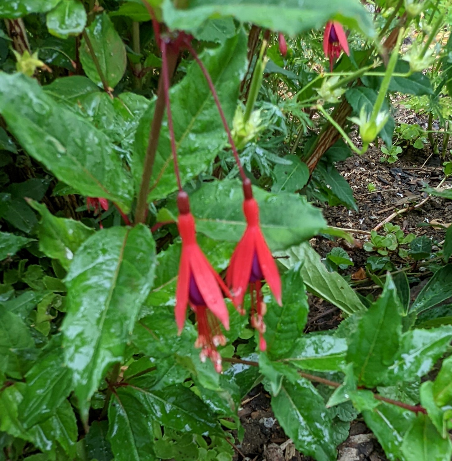 Mein Boden ist auch ziemlich lehmhaltig, aber das mögen die Fuchsien doch eigentlich gerne!? Beim Einpflanzen kommt auch immer noch eine Handvoll guter Erde mit ins Pflanzloch und das kräftige Angießen muss auch sein. Die Grayrigg hatte ich im vergangenen Jahr umgepflanzt, anfangs wurde sie tagsüber immer schlapp und ich dachte, das geht nicht gut! Dieses Jahr ist sie die erste, die super gewachsen ist und viele Blüten trägt! Ernst Naschke zeigt auch schon eine Menge Blüten und bei Genii ist das die erste Blüte, sie sieht noch nicht so toll aus, finde ich! Gracilis habe ich im Frühjahr umgesetzt, sie kämpft auch noch mit ihrem neuen Platz, sie ist noch nicht so hoch wie die letzten Jahre!