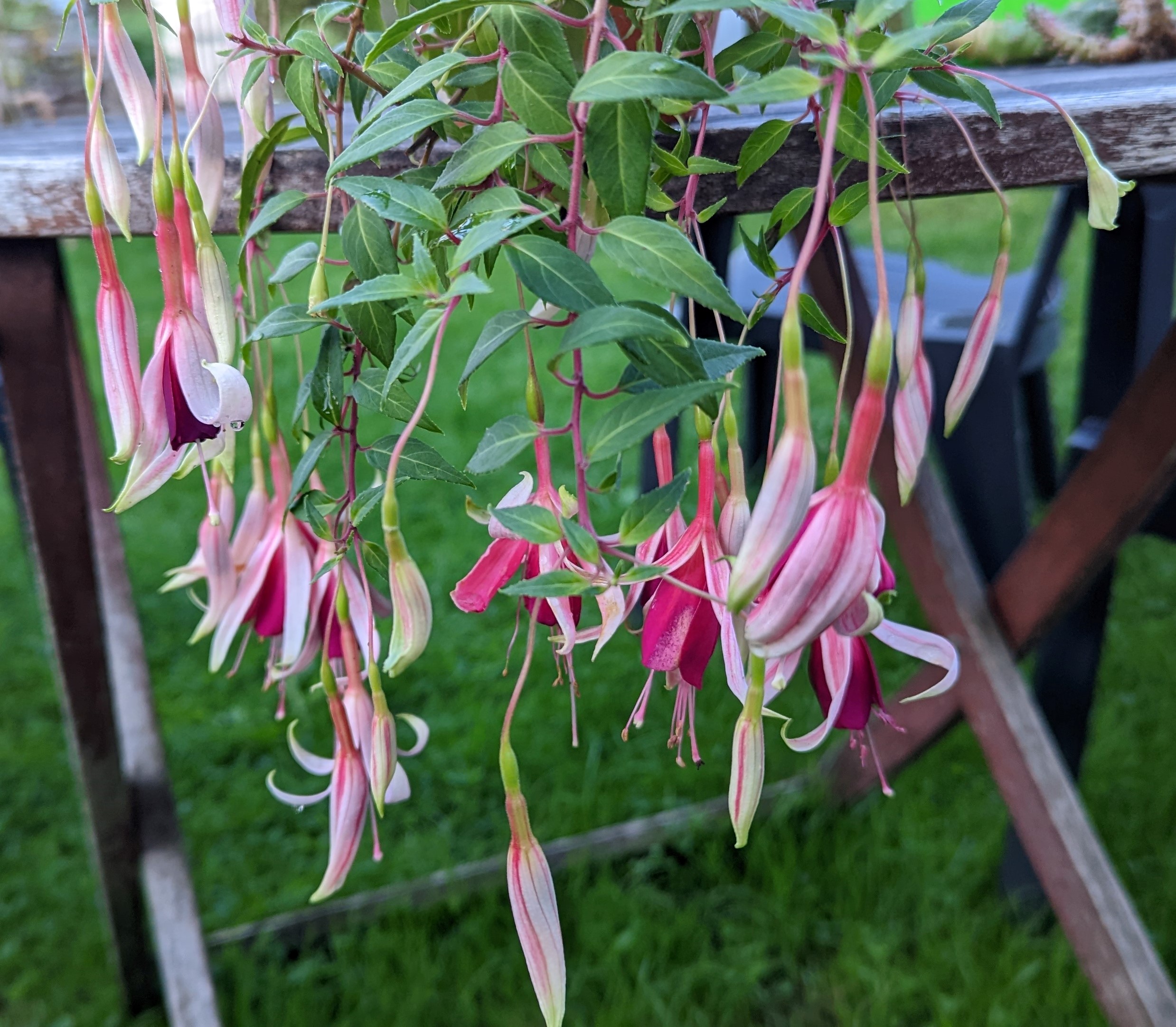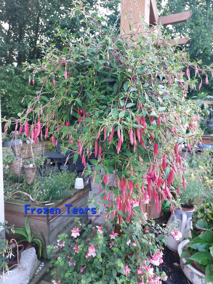 "Icy Tears" habe ich 2 oder 3 Jahre schon.Eine wirklich intressante Fuchsie.Ich habe sie in einer kleinen Ampel welche dieses Jahr vielleicht nicht überlebt und als einen Hochstamm.Das ist bei diesen dünnen Stängeln schon eine Herausforderung.Sie hat gut 1,7m und treibt auch schon recht gut aus.