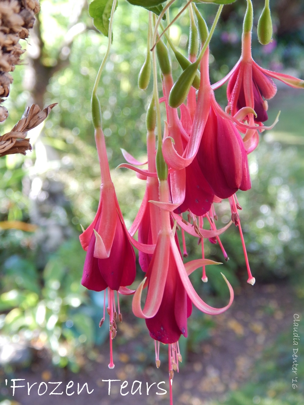 Wie alle wissen ist die ’Icy Tears’ein Sport der ’Frozen Tears’ und in der Pflege bzw. Überwinterung gibt es bei mir keine Unterschiede. Ich überwintere im kühlen Gewächshaus bei 3° bis 5° Grad. Das gilt für alle Fuchsien, also auch die Triphyllas. Das klappt aber nur, wenn man die Pflanzen nicht vergießt. Auf jeden Fall ist das eine ganz tolle hängende Sorte mit wunderschönen gestreiften Blüten.
