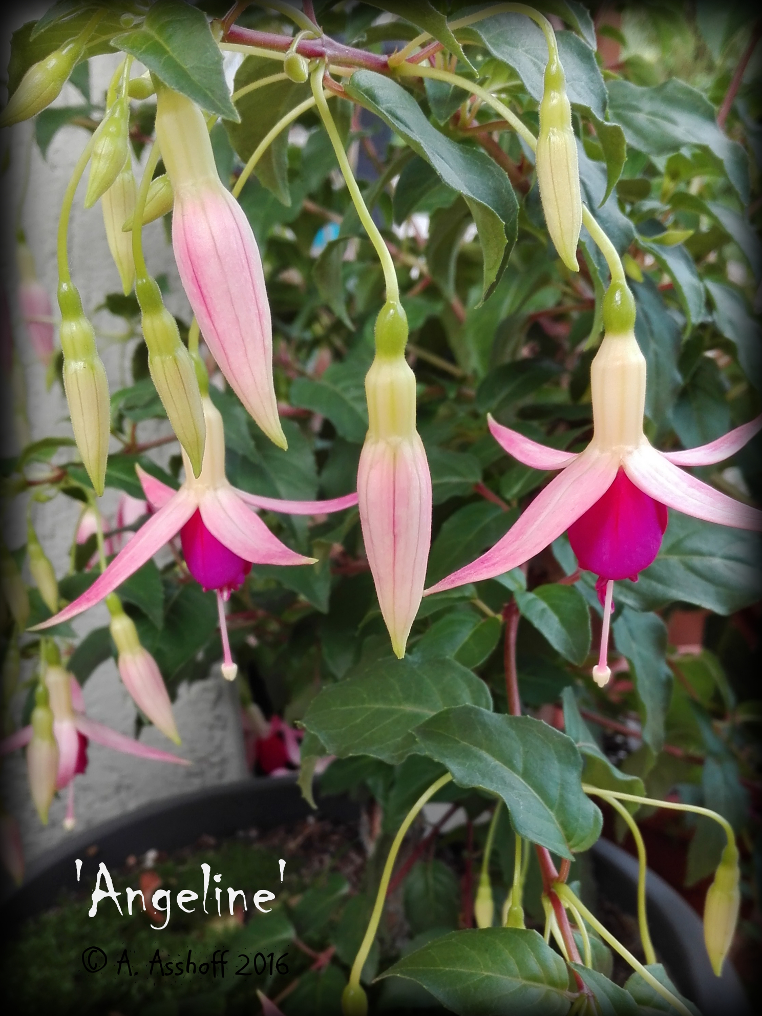 Da die 'Angeline' nun auf unseren Shirts ist, möchte ich sie euch auch einmal vorstellen. Sie wächst überhängend, ist sehr kräftig und wirkt dabei doch recht grazil. Sie blüht sehr reichlich ohne große Pause bis zum Frost und gedeiht fast an allen Standorten. Sie ist einfachblühend. Der Tubus und die Sepalen sind cremeweiß. In der Sonne färbt sich die Sepalenunterseite schön kräftig Rosa aus. Die Korolle ist pink/violett. Sie scheint zu den Sorten zu gehören, die fast unverwüstlich sind. Die große Hitze vor 2 Jahren hat sie ohne Schäden locker weggesteckt. Ich ziehe mir gerade einen Hochstamm. Diesen stelle ich mir bei dieser Sorte wirklich toll vor. Ich habe sie schon einige Jahre und sie ist weder anfällig für Rost noch für Schädlinge. Auch kommt sie sicher durch den Winter. Besonders toll finde ich sie im Herbst, wenn es draußen so schmuddelig und grau wird, da bringen diese frischen eleganten Blüten noch mal den Sommer zurück