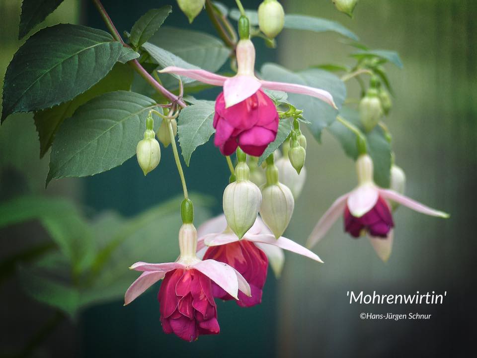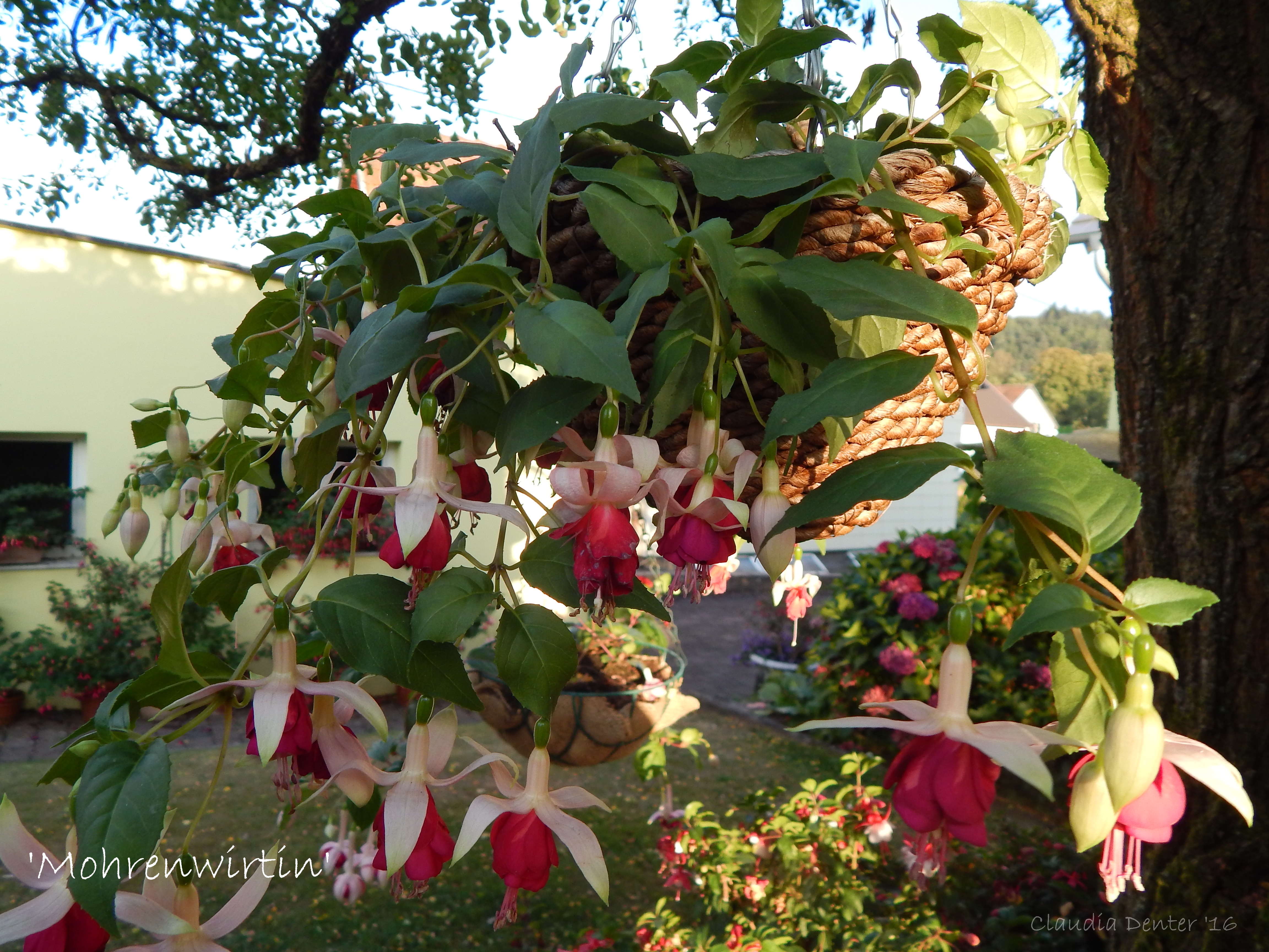 Die 'Mohrenwirtin' ist eine wunderbar gefüllt blühende Fuchsie mit großer Leuchtktaft. Bei mir ließ sich sich leicht überwintern und machte auch sonst keinerlei Probleme. Ich habe sie in einer Ampel und sie hängt halbschattig.