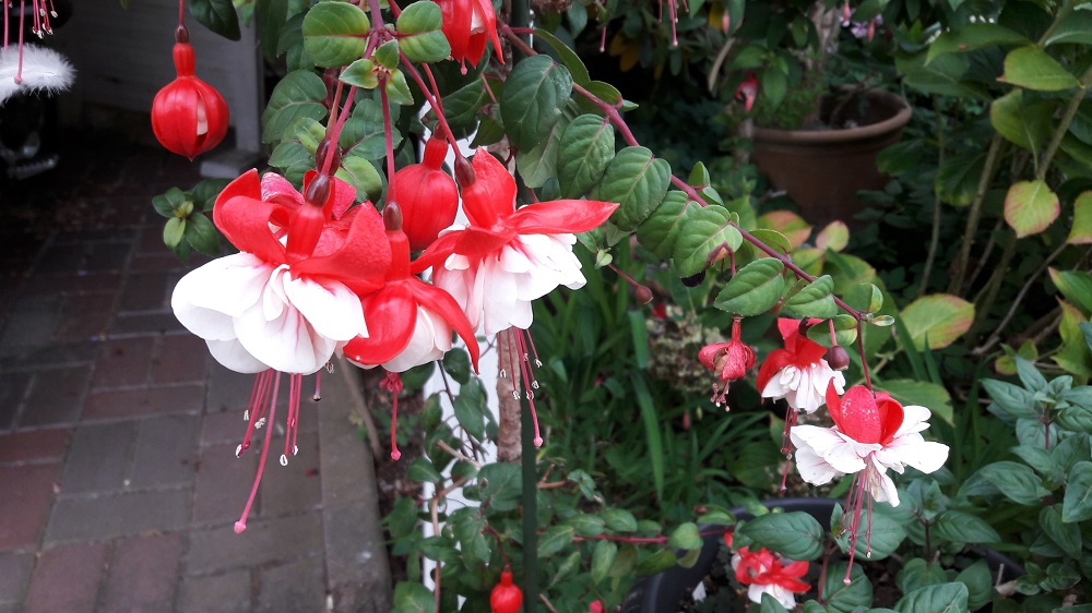 "Swingtime" hab ich erst seit ca 3 Jahren.Mir war aufgefallen das viele Bekante sagten:Du hast ja garnicht die schöne rot weiße gefüllte Fuchsie.Nun rot weiß ist nicht so ganz meine Richtung doch da dachte ich die mußt du halt doch erwerben.Mittlerweile habe ich nicht nur die "Swingtime" welche ein stattlicher großer Busch wurde sonder auch die "Snow Burner" welche ich meine noch größere Blüten hat.