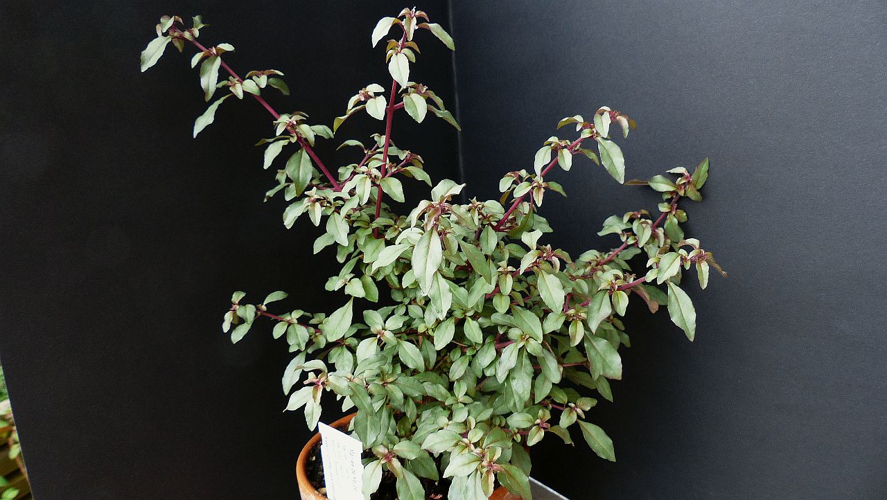 Etwas abweichend vom Thema keine Fuchsie mit panaschierten oder zweifarbigen Blättern, aber mit starkem Farbkontrast zwischen den roten Zweigen und den nicht wirklich grünen Blättern, irgendwas zwischen blaugrün und silber, eine "Marlies de Keijzer":