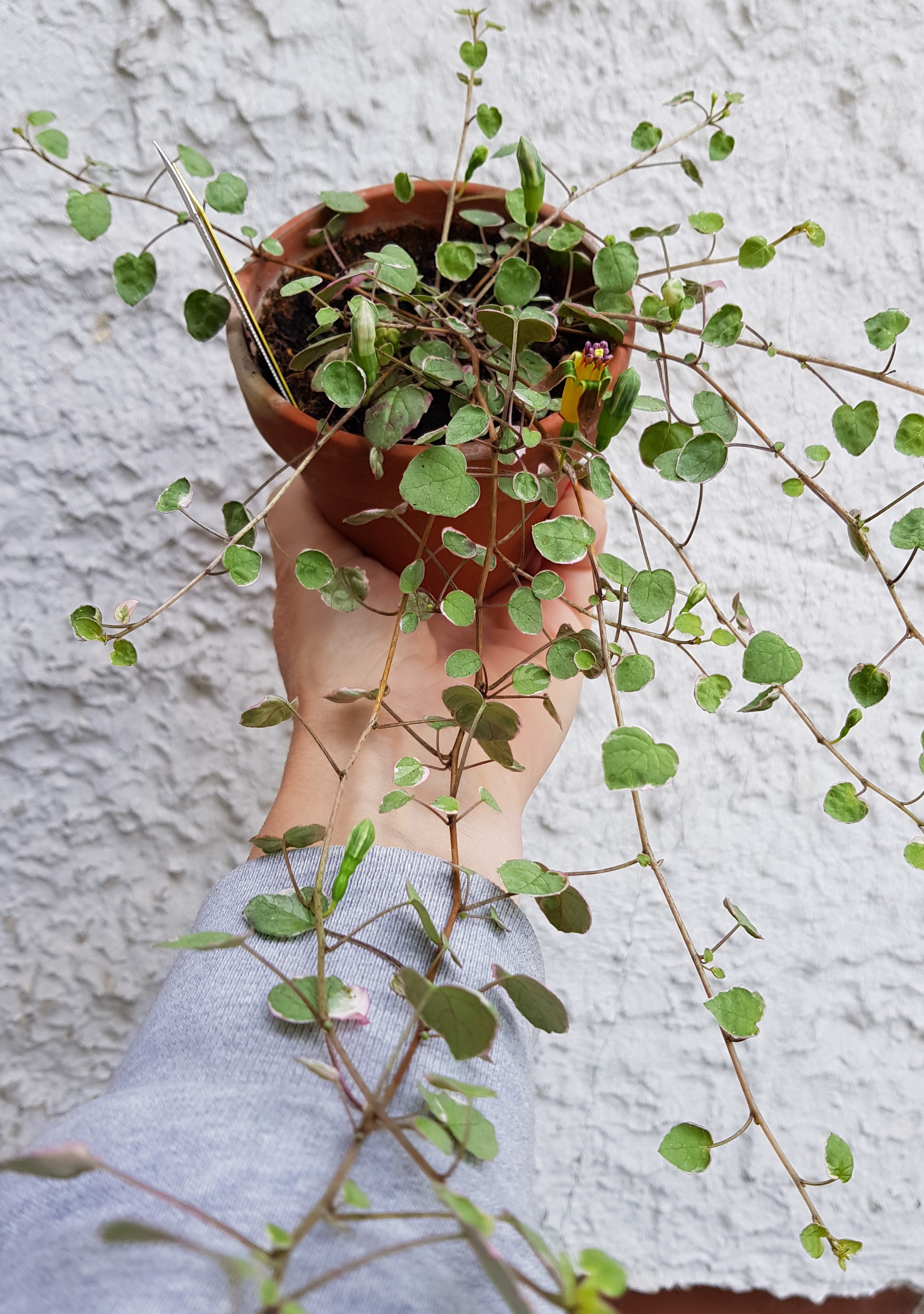 Ich habe ein Problem mit Kunststofftöpfen. Da die Pflanze zu üppig war, konnte ich sie nicht umtopfen. Ich denke, dann ist sie halb ersoffen und ich habe sie zurück geschnitten und in einen Tontopf gesetzt. Die Teile die noch lebten, sind auch wieder ausgetrieben. Muß den Topf unbedingt verkleinern.