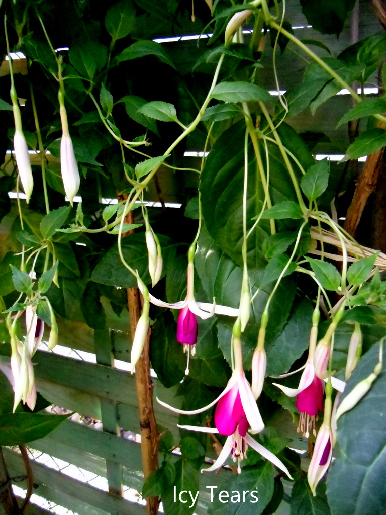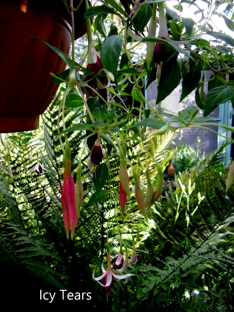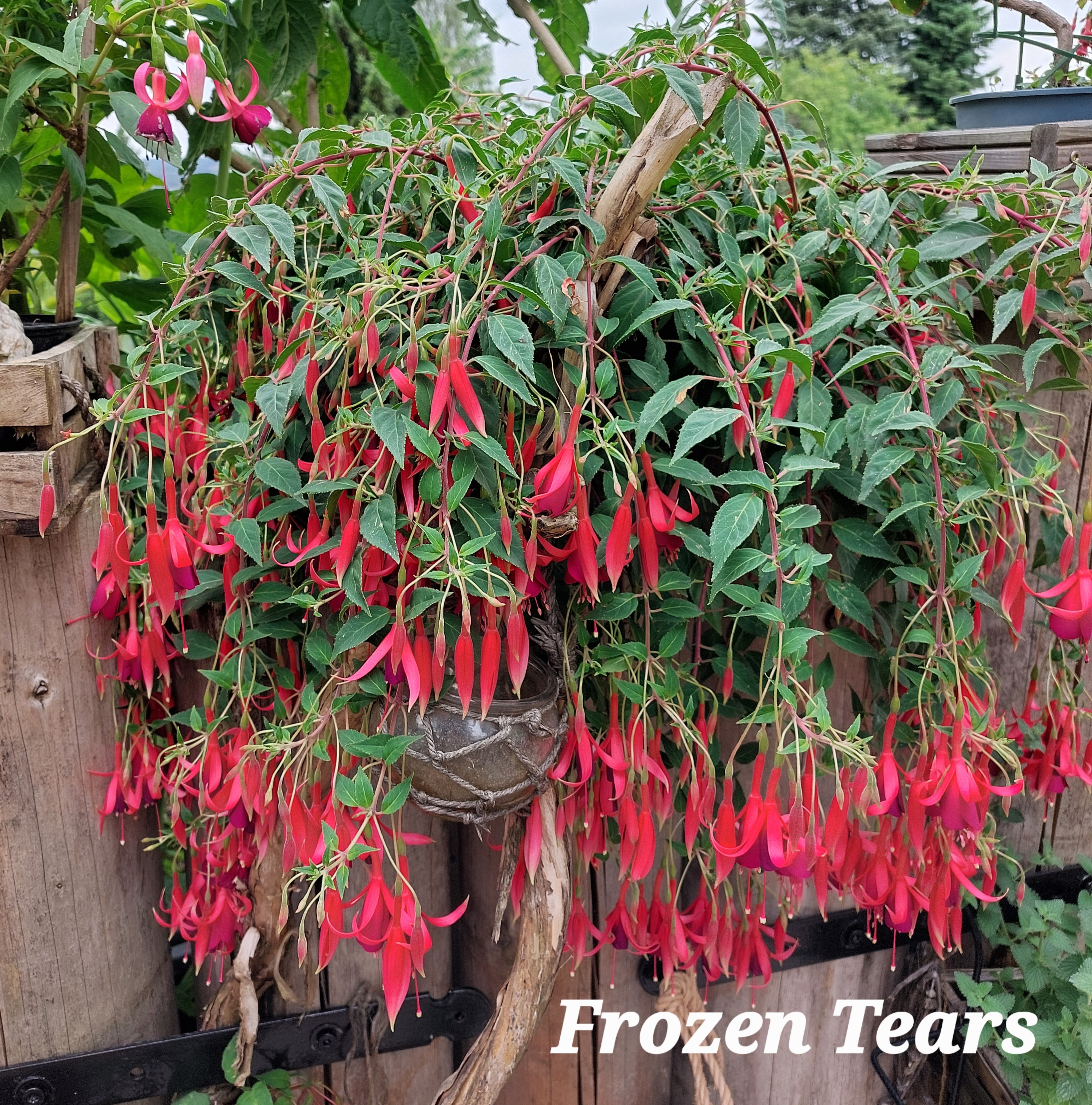 Ich bin mal wieder hier und habe diesen Beitrag über die schöne ’ICE Tears’ entdeckt. ICE Tears ist ein Sport der ’Frozen Tears’ und nicht umgekehrt. Wenn sich in solchen Pflanzen Äste zur Ausgangsform zurückbilden, sollten diese unbedingt zeitnah entfernt werden, weil man sonst wieder die komplette Ausgangspflanze hat, aber wer will das schon bei diesem einmalig schönen Sport. Ich liebe an ihr die gestreiften Blütenblätter. Außerdem mag ich es, wenn Fuchsien so kompakt wachsen. Ich habe im vergangenen Jahr mit einem kleinen Steckling einer lieben Fuchsienfreundin begonnen und dieser Steckling hat im Winterquartier gar nicht aufgehört zu wachsen. Ich habe zwei weitere Stecklinge bewurzelt und alle in eine Ampel gepflanzt. Wer sie sieht, möchte einen Steckling und deshalb sieht einer meiner bewurzelten Stecklinge schon aus wie ein Bodendecker. Die Ausgangspflanze blüht so üppig, dass man davon keine Stevklinge schneiden kann. Für mich ist diese Sorte neuerdings eine der schönsten Ampelfuchsien und wenn die Ampel mal so aussieht, wie ich mir das vorstelle gibt es auch Fotos. Eine Momentaufnahme füge ich aber doch noch gern hinzu.