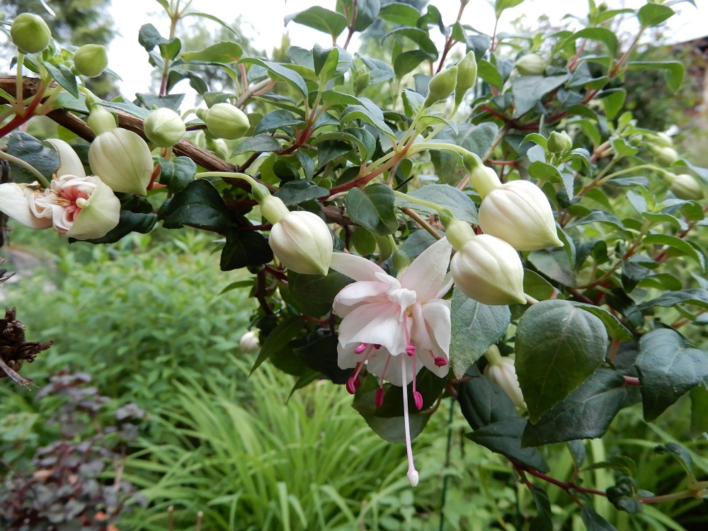 Die hatte ich auch 2 oder 3 Jahre .Eine eher unauffällige Fuchsie die gerne im Hinterkopf verschwindet.Sie ist sehr hübsch sehr weiß hat die roten Staubgefäße von "Bobby Shafto" und ist ihr in vielem ähnlich.