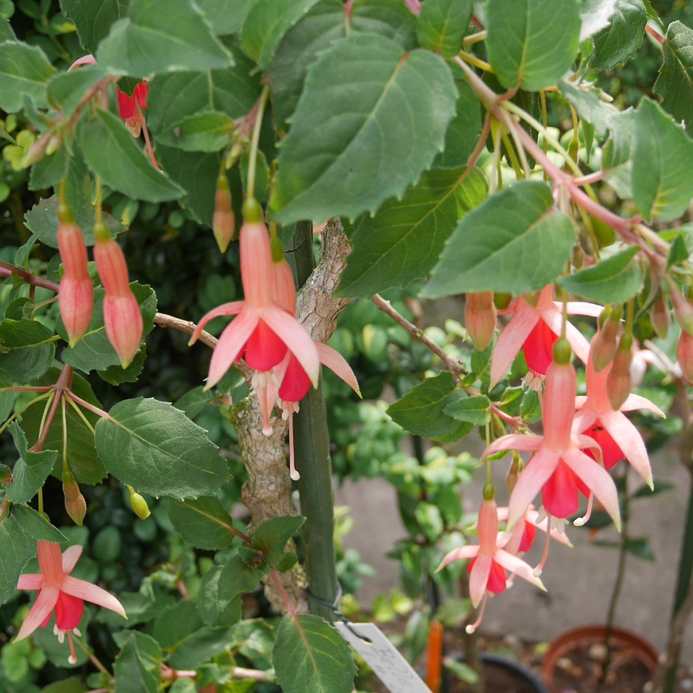 Das ist in dem Fall sehr schade. Gerade die schöne rot-orangefarbene Farbgebung ist besonders. Im Grunde ist es eine typische Fuchsie aus der Hand des Züchters Hartwig Schütt (2005)