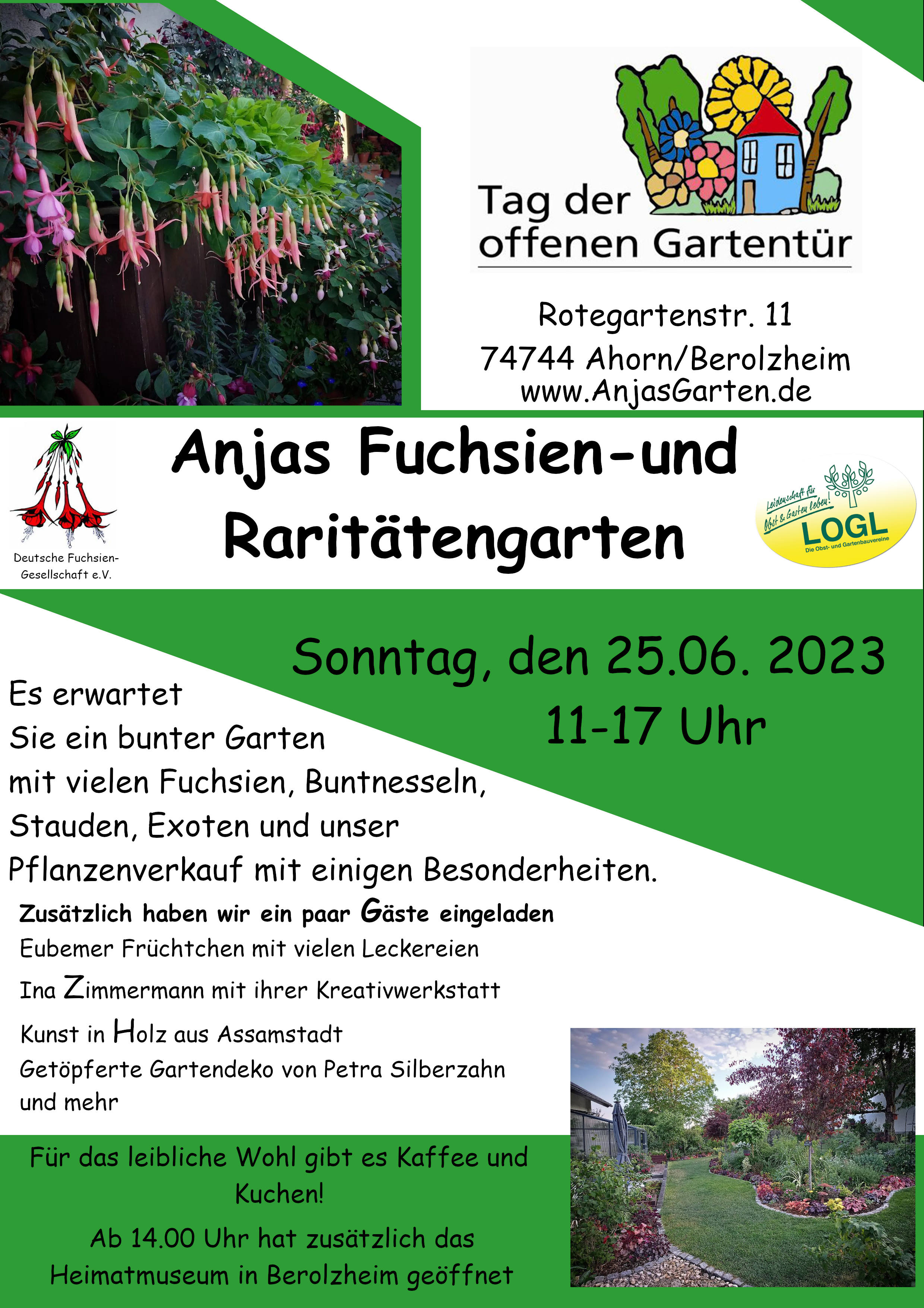 dieses Jahr gibt es wieder den Tag der offenen Gartentür unter dem Schirm des Landesverbands für Obstbau, Garten und Landschaft. Da darf natürlich der offene Fuchsiengarten und die DFG nicht fehlen. Also haben wir und todesmutig angemeldet. Der Termin fällt genau auf unseren Hochzeitstag