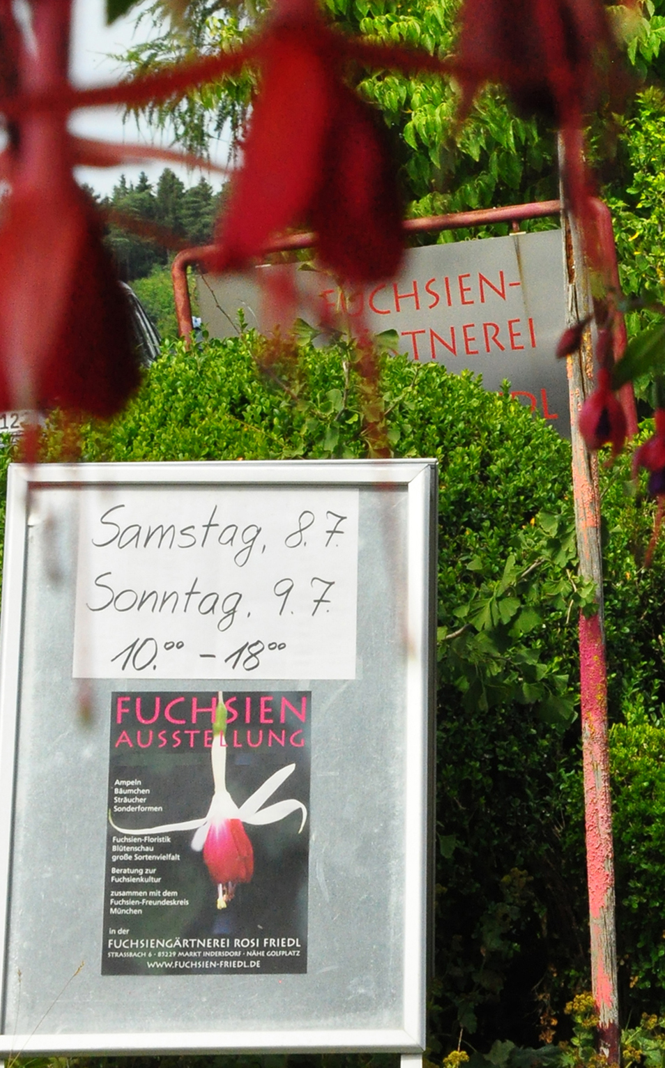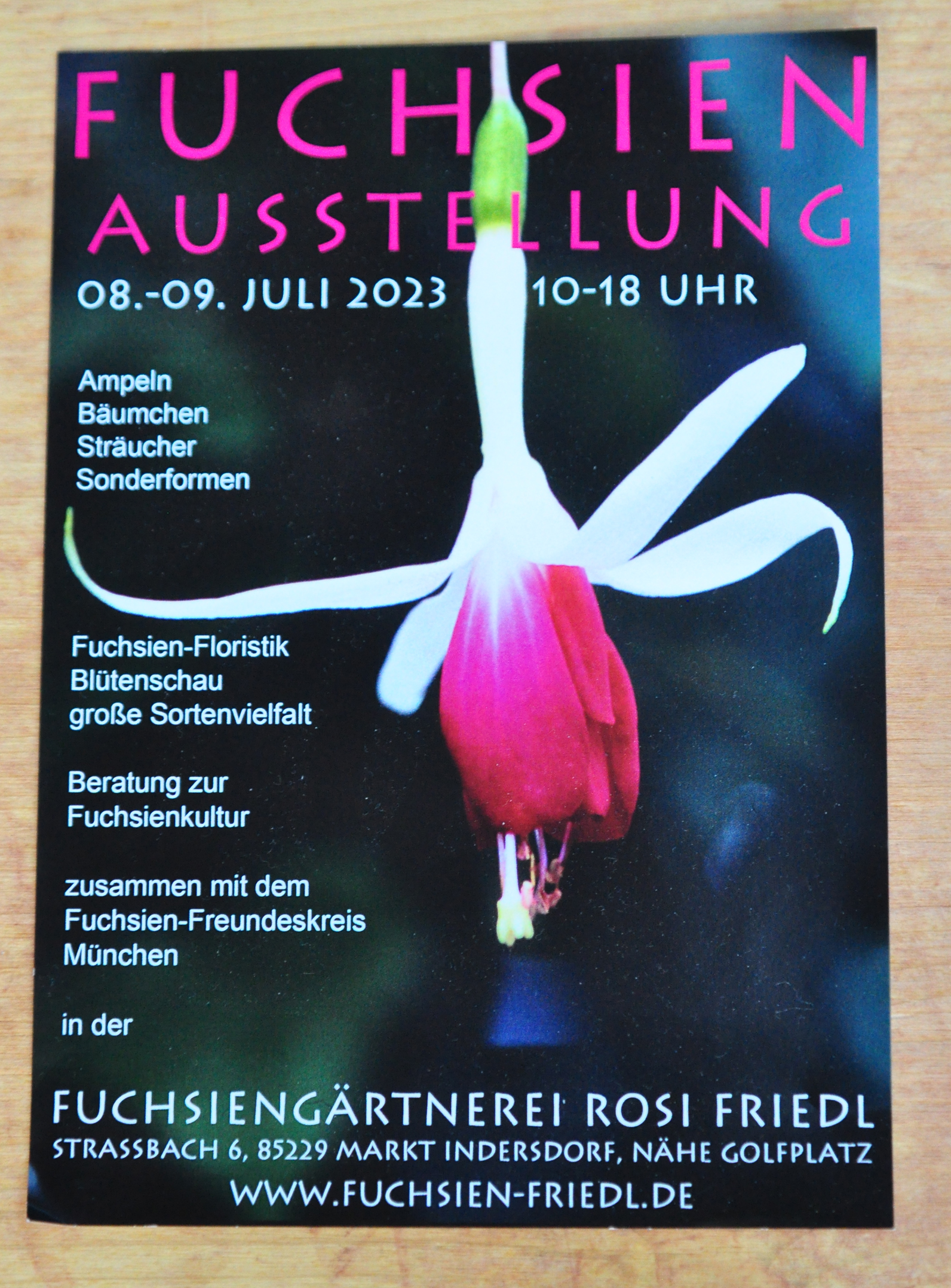 Auch der Freundeskreis München veranstaltet eine Fuchsiensonderausstellung am Samstag 8. und Sonntag 9. Juli 2023, jeweils von 10 bis 18 Uhr zusammen mit Rosi Friedl in der Fuchsiengärtnerei Rosi Friedl, Straßbach 6, 85229 Markt Indersdorf.