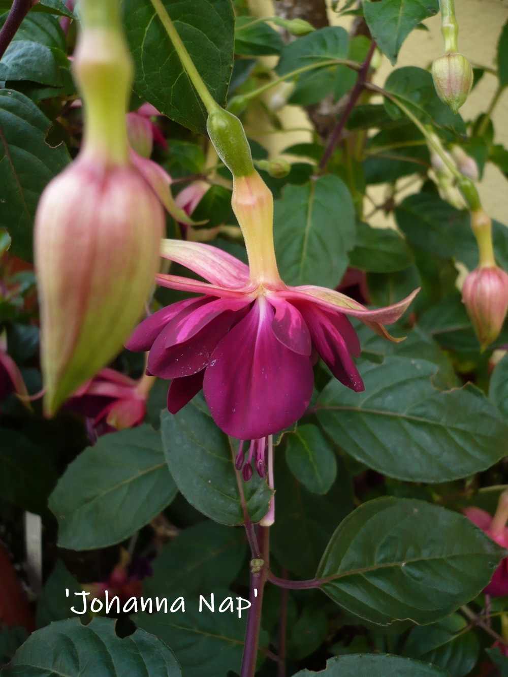 'Johanna Nap' ist eine Fuchsie mit hohem Wiedererkennungswert. Alleine die besondere Farbzusammenstellung ist bemerkenswert.