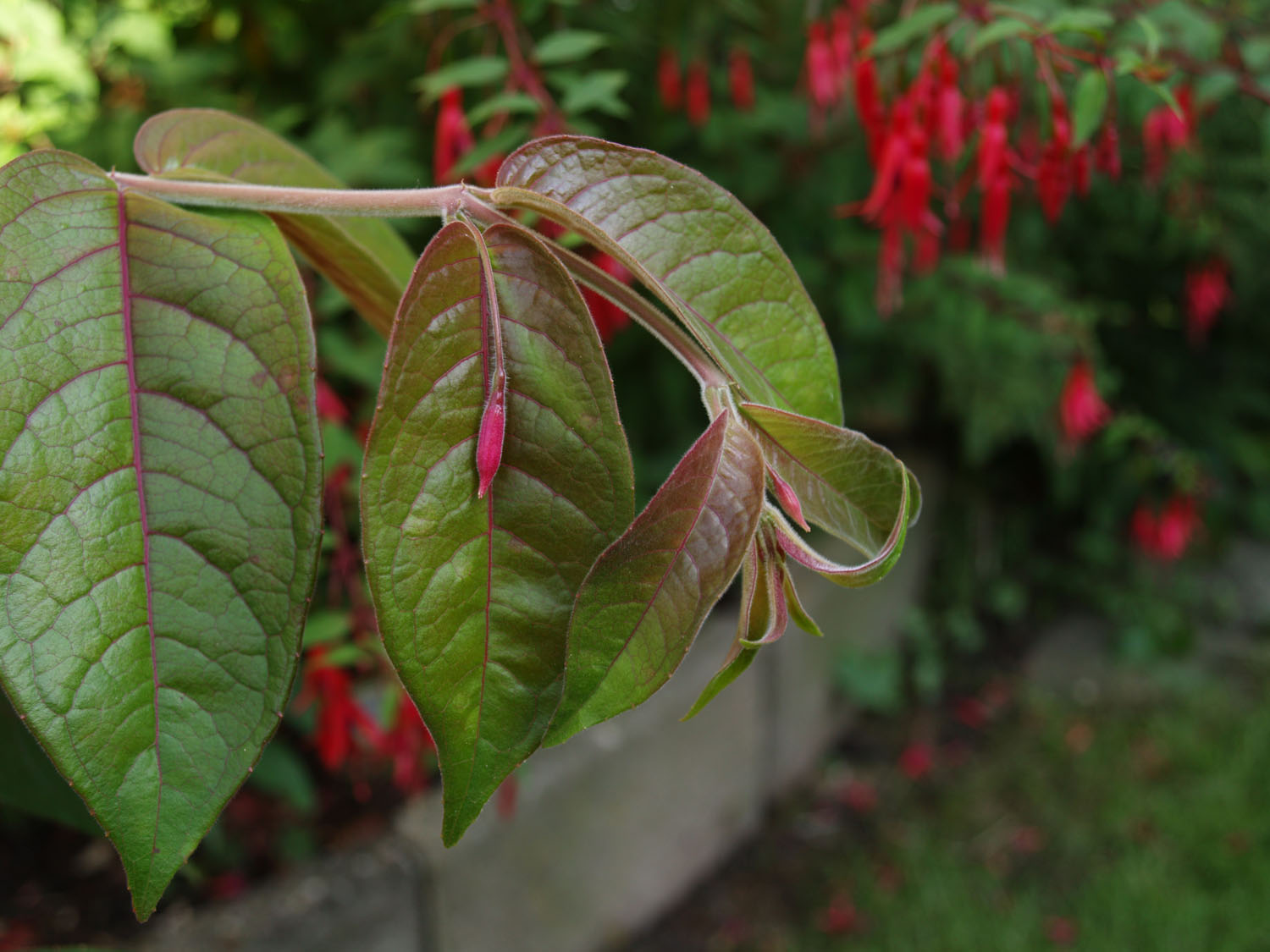 Die lianenartigen Zweige tragen grosse Blätter mit einem roten Anflug.