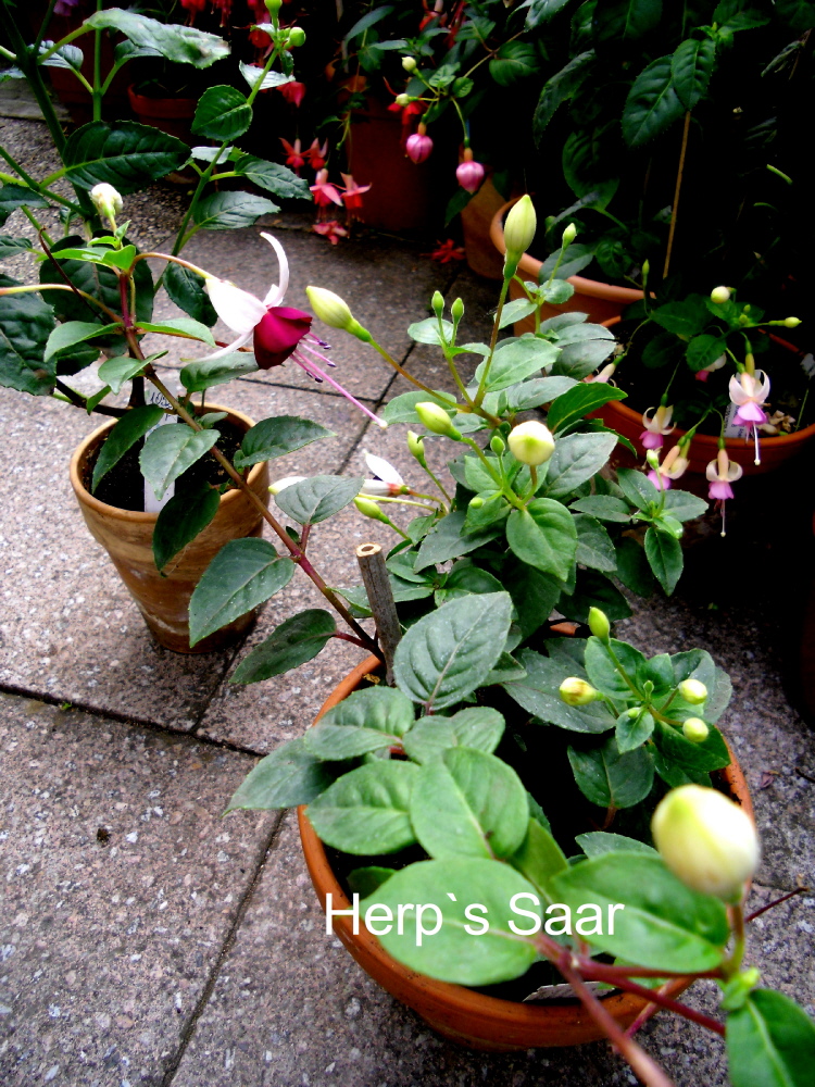Ich habe an dieser Stelle eine kleine Gruppe von kleinblühenden Fuchsien stehen."Herp´s Saar",Herp´s Mignon",Eleanor Leytham".Micky Goult" und "Countess of Aberdeen" ich finde diese Sorten gehen zwischen den anderen Fuchsien unter.Der Halbschtten mit hoher Luftfeuchte bekommt allen sehr gut