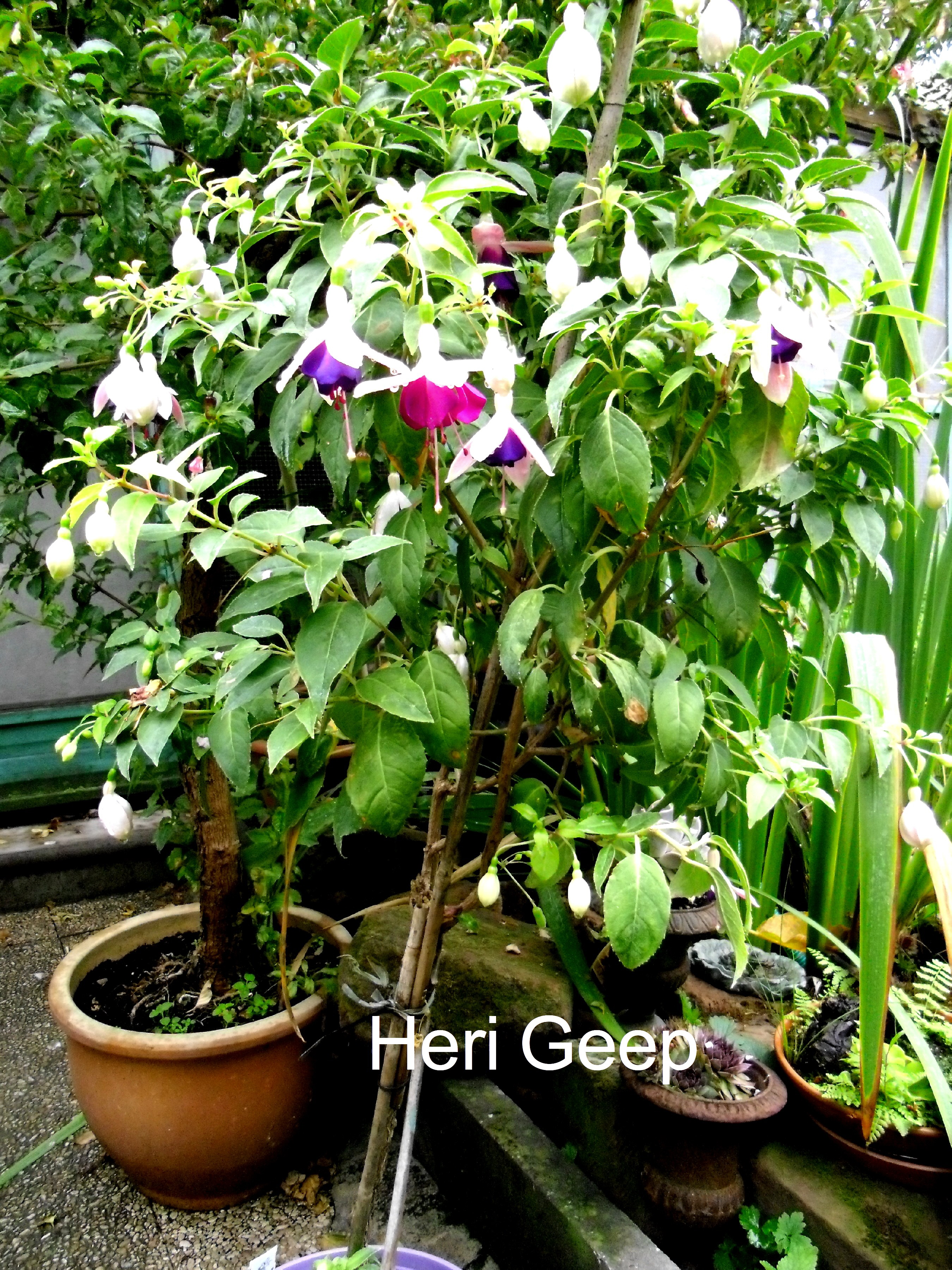 "HeRi Green" habe ich in all den Jahren noch nie gehört aber "HeRi Geep" habe ich schon sehr lange.Eine sehr robuste Sorte in klaren Farben Weiß/creme Die Petalen die Korolle ein dunkles lila zu weinrot verblühend eine recht große ungefüllte Blüte.In kurzer Zeit hat man einen Hochstamm und fast jeder Steckling bewurzelt.Früh und Dauerblühend eine Anfängerfuchsie.