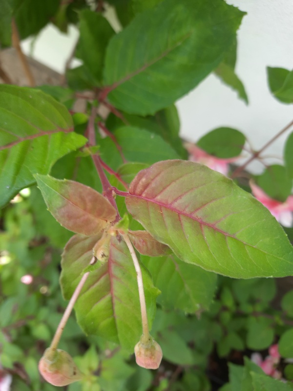 Die Blüte hat eine geflammte Korolle in Magenta /Orange. Das Handy gibt den Naturfarbton nicht genau wieder. Markant ist auch der Blattaustrieb.Neue Blätter sind hellgrün/ rötlich gezeichnet.Mir gefällt diese Fuchsie sehr gut, darum möchte ich sie hier zeigen.Vielleicht hat jemand von Euch eine Idee zum richtigen Namen.