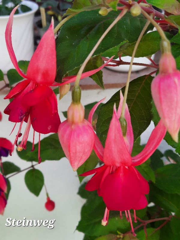 Ich besitze schon ganz viele Jahre eine Fuchsie, deren Name erfunden ist, weil der richtige Name leider nicht ermittelt werden konnte. Ich habe die Pflanze mal in der Gärtnerei Bechtel unter der Bezeichnung ' Steinweg ' gekauft. Die Mutterpflanze stand immer zur Überwinterung in der Gärtnerei und der Besitzer kannte den Namen leider auch nicht. Also bekam sie den Namen 'Steinweg ', das ist die Anschrift der Gärtnerei. Es ist aber eine sehr schöne Fuchsie und ich möchte sie hier kurz vorstellen. Sie ist sehr starkwüchsig und verholzt gut. Ich hatte viele Jahre ein Hochstämmchen, das aber nicht mehr lebt.Aber ich mache mir immer eine Sicherheitskopie.